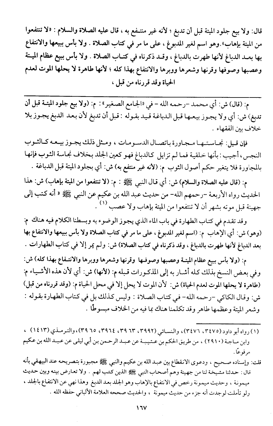 م: (قال - عَلَيْهِ الصَّلَاةُ وَالسَّلَامُ -) ش: أي قال النبي - صَلَّى اللَّهُ عَلَيْهِ وَسَلَّمَ -: م: «لا تنتفعوا من الميتة بإهاب» ش: هذا الحديث رواه الأربعة - رَحِمَهُمُ اللَّهُ - من حديث عبد الله بن عكيم عن النبي - صَلَّى اللَّهُ عَلَيْهِ وَسَلَّمَ - «أنه كتب إلى جهينة قبل موته بشهر أن لا تنتفعوا من الميتة بإهاب ولا عصب» .