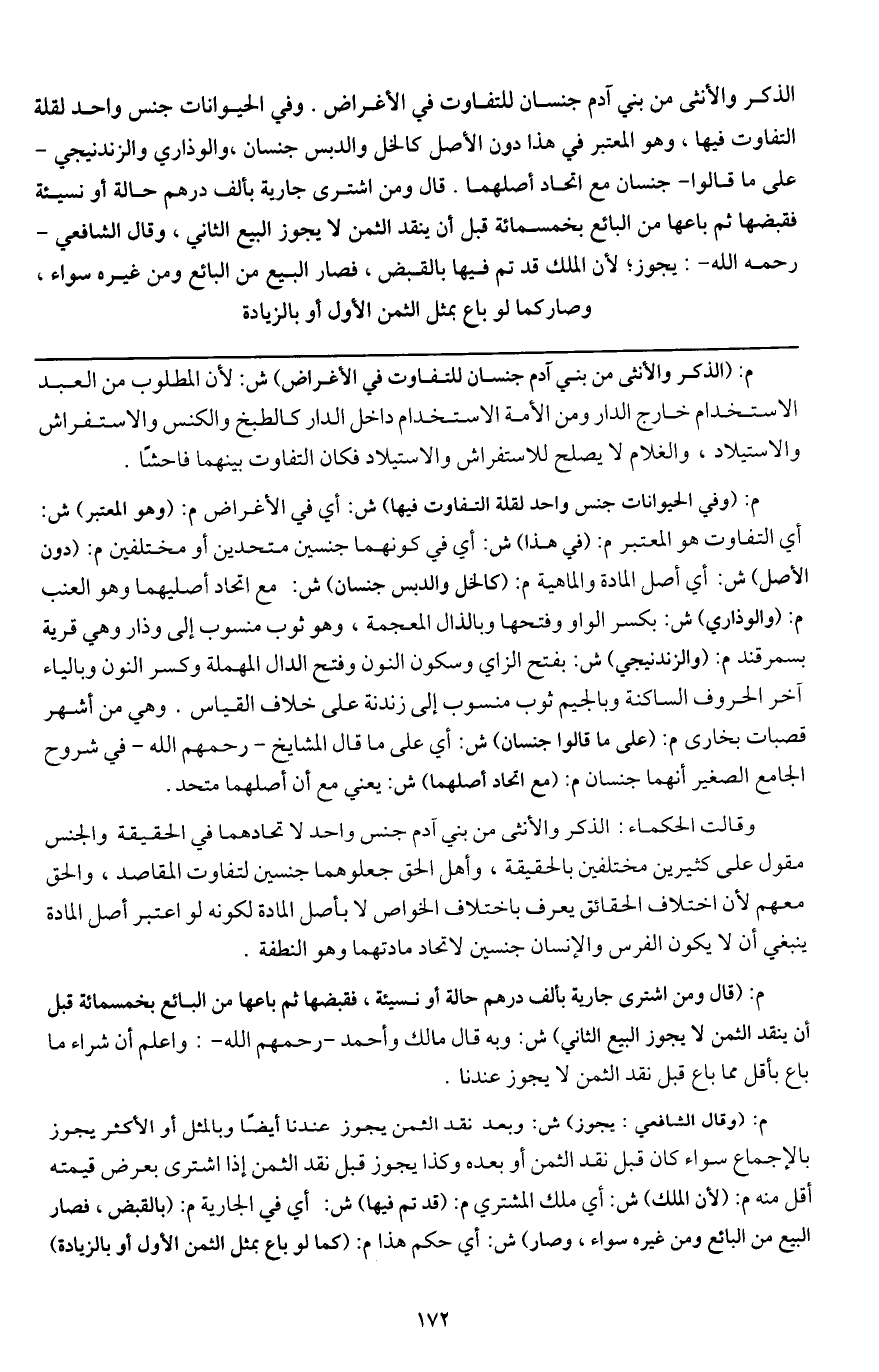 الذكر والأنثى من بني آدم جنسان للتفاوت في الأغراض. وفي الحيوانات جنس واحد لقلة التفاوت فيها، وهو المعتبر في هذا دون الأصل كالخل والدبس جنسان، والوذاري والزندنيجي - على ما قالوا - جنسان مع اتحاد أصلهما.