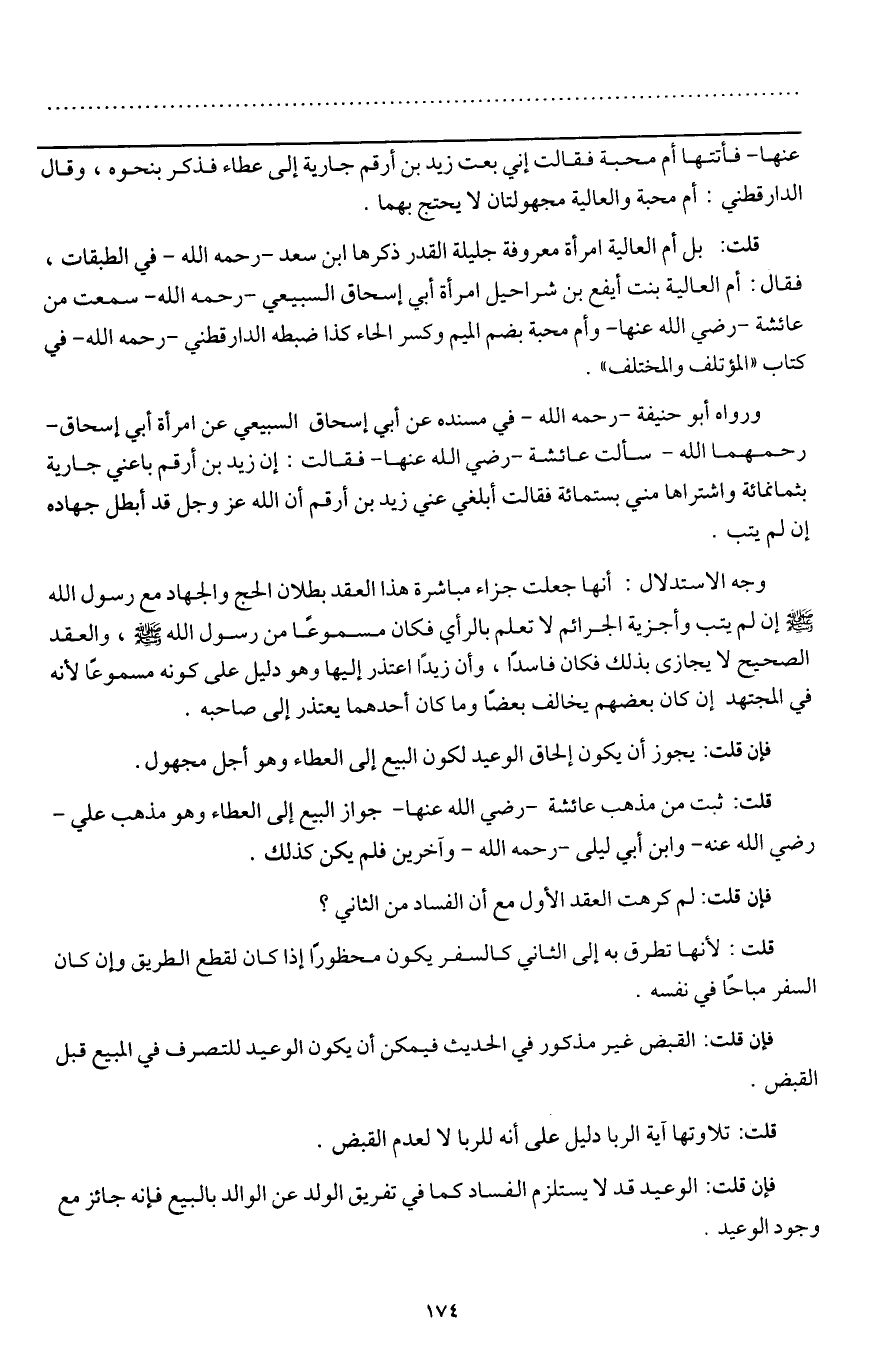 ورواه أبو حنيفة - رَحِمَهُ اللَّهُ - في مسنده عن أبي إسحاق السبيعي عن امرأة أبي إسحاق - رحمهما الله - سألت عائشة - رَضِيَ اللَّهُ عَنْهَا - فقالت: إن زيد بن أرقم باعني جارية بثمانمائة واشتراها مني بستمائة فقالت: أبلغي عني زيد بن أرقم أن الله عز وجل قد أبطل جهاده إن لم يتب.