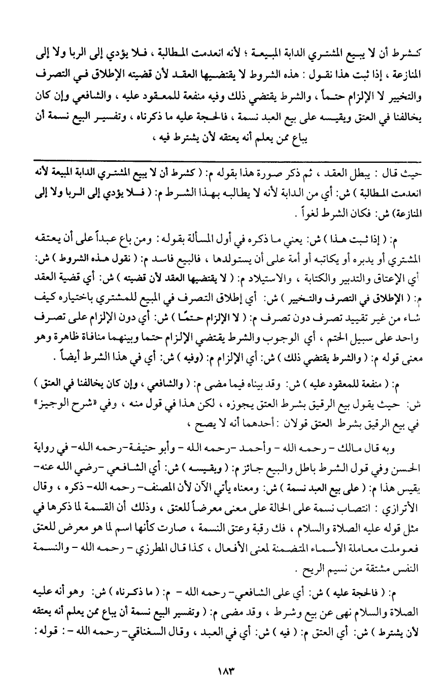 كشرط أن لا يبيع المشتري الدابة المبيعة؛ لأنه انعدمت المطالبة، فلا يؤدي إلى الربا ولا إلى المنازعة، إذا ثبت هذا نقول: هذه الشروط لا يقتضيها العقد لأن قضيته الإطلاق في التصرف والتخيير لا الإلزام حتما، والشرط يقتضي ذلك وفيه منفعة للمعقود عليه، والشافعي وإن كان يخالفنا في العتق ويقيسه على بيع العبد نسمة، فالحجة عليه ما ذكرناه، وتفسير البيع نسمة أن يباع ممن يعلم أنه يعتقه لأن يشترط فيه،