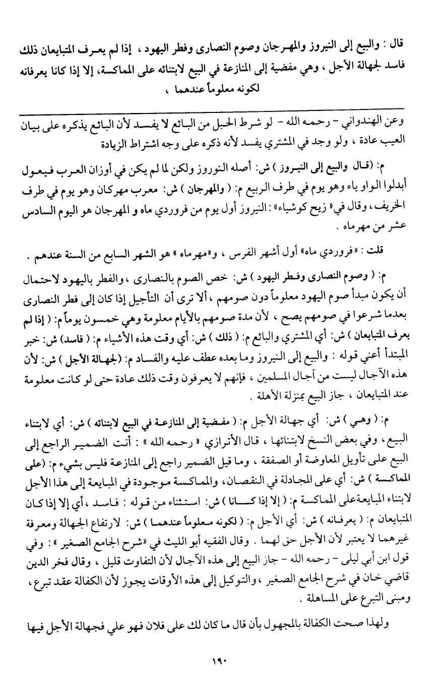 قال: والبيع إلى النيروز والمهرجان وصوم النصارى وفطر اليهود، إذا لم يعرف المتبايعان ذلك فاسد لجهالة الأجل، وهي مفضية إلى المنازعة في البيع لابتنائه على المماكسة، إلا إذا كانا يعرفانه لكونه معلوما عندهما.