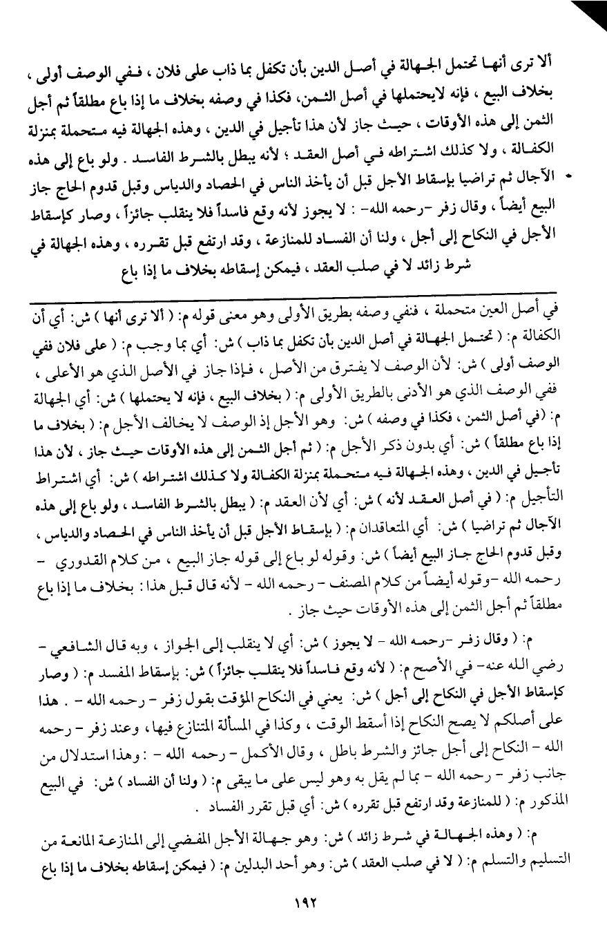 ألا ترى أنها تحتمل الجهالة في أصل الدين بأن تكفل بما ذاب على فلان، ففي الوصف أولى، بخلاف البيع، فإنه لا يحتملها في أصل الثمن، فكذا في وصفه بخلاف ما إذا باع مطلقا ثم أجل الثمن إلى هذه الأوقات، حيث جاز لأن هذا تأجيل في الدين، وهذه الجهالة فيه متحملة بمنزلة الكفالة، ولا كذلك اشتراطه في أصل العقد؛ لأنه يبطل بالشرط الفاسد. ولو باع إلى هذه الآجال ثم تراضيا بإسقاط الأجل قبل أن يأخذ الناس في الحصاد والدياس وقبل قدوم الحاج جاز البيع أيضا، وقال زفر - رَحِمَهُ اللَّهُ -: لا يجوز لأنه وقع فاسدا فلا ينقلب جائزا، وصار كإسقاط الأجل في النكاح إلى أجل، ولنا أن الفساد للمنازعة، وقد ارتفع قبل تقرره، وهذه الجهالة في شرط زائد لا في صلب العقد، فيمكن إسقاطه بخلاف ما إذا باع