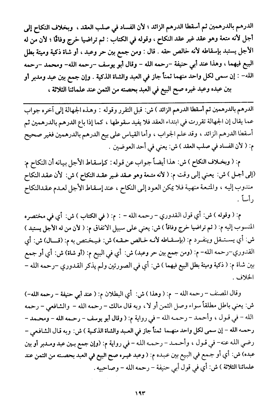 وقوله في الكتاب: ثم تراضيا خرج وفاقا؛ لأن من له الأجل يستبد بإسقاطه لأنه خالص حقه. قال: ومن جمع بين حر وعبد، أو شاة ذكية وميتة بطل البيع فيهما، وهذا عند أبي حنيفة - رَحِمَهُ اللَّهُ - وقال أبو يوسف - رَحِمَهُ اللَّهُ - ومحمد - رَحِمَهُ اللَّهُ -: إن سمى لكل واحد منهما ثمنا جاز في العبد والشاة الذكية. وإن جمع بين عبد ومدبر أو بين عبده وعبد غيره صح البيع في العبد بحصته من الثمن عند علمائنا الثلاثة،