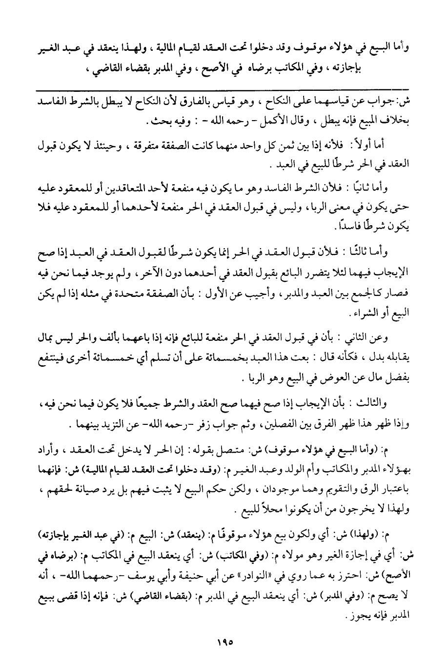 وأما البيع في هؤلاء موقوف وقد دخلوا تحت العقد لقيام المالية، ولهذا ينعقد في عبد الغير بإجازته، وفي المكاتب برضاه في الأصح، وفي المدبر بقضاء القاضي،