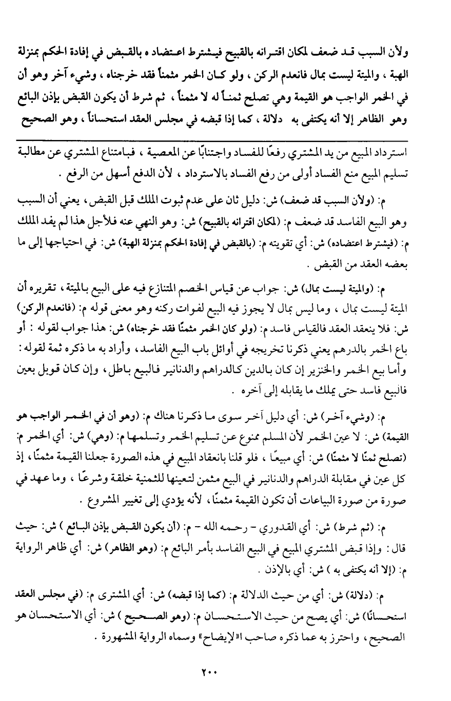 ولأن السبب قد ضعف لمكان اقترانه بالقبيح فيشترط اعتضاده بالقبض في إفادة الحكم بمنزلة الهبة، والميتة ليست بمال فانعدم الركن، ولو كان الخمر مثمنا فقد خرجناه، وشيء آخر وهو أن في الخمر الواجب هو القيمة وهي تصلح ثمنا له لا مثمنا، ثم شرط أن يكون القبض بإذن البائع وهو الظاهر إلا أنه يكتفى به دلالة، كما إذا قبضه في مجلس العقد استحسانا، وهو الصحيح
