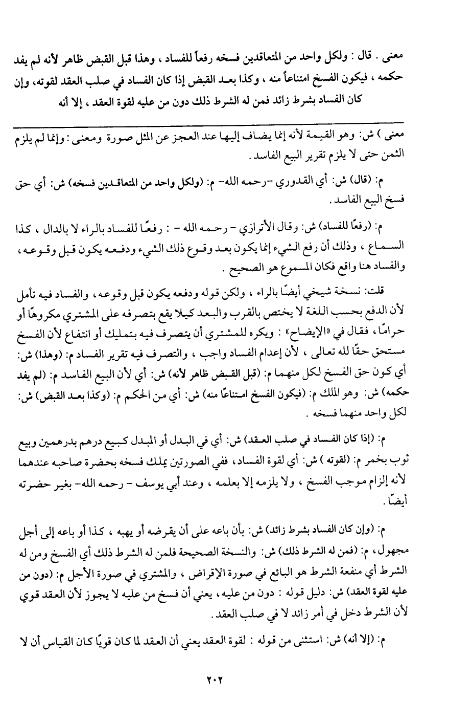 معنى قال: ولكل واحد من المتعاقدين فسخه رفعا للفساد، وهذا قبل القبض ظاهر لأنه لم يفد حكمه، فيكون الفسخ امتناعا منه، وكذا بعد القبض إذا كان الفساد في صلب العقد لقوته، وإن كان الفساد بشرط زائد فمن له الشرط ذلك دون من عليه لقوة العقد، إلا أنه