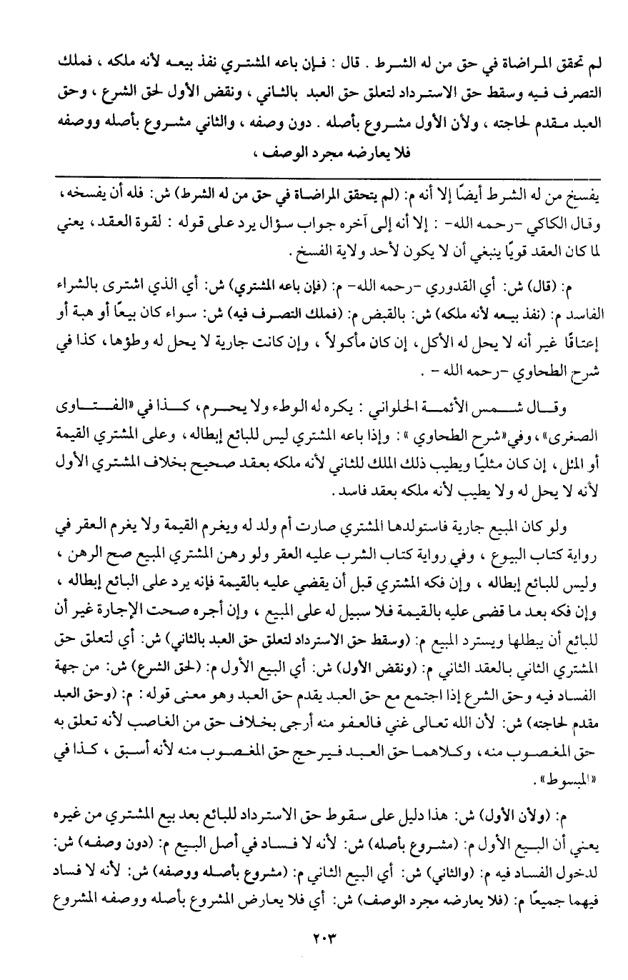 قال: فإن باعه المشتري نفذ بيعه لأنه ملكه، فملك التصرف فيه وسقط حق الاسترداد لتعلق حق العبد بالثاني، ونقض الأول لحق الشرع، وحق العبد مقدم لحاجته، ولأن الأول مشروع بأصله. دون وصفه، والثاني مشروع بأصله ووصفه فلا يعارضه مجرد الوصف.