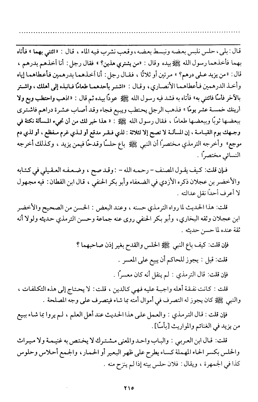 ـــــــــــــــــــــــــــــQقال: بلى، حلس نلبس بعضه ونبسط بعضه، وقعب نشرب فيه الماء، قال: "ائتني بهما" فأتاه بهما فأخذهما رسول الله - صَلَّى اللَّهُ عَلَيْهِ وَسَلَّمَ - بيده وقال: "من يشتري هذين؟ " فقال رجل: أنا آخذهم بدرهم، قال: "من يزيد على درهم؟ " مرتين أو ثلاثا، فقال رجل أنا آخذهما بدرهمين فأعطاهما إياه وأخذ الدرهمين فأعطاهما الأنصاري، وقال: اشتر بأحدهما طعاما فانبذه إلى أهلك، واشتر بالآخر فأسا فائتني به". فأتاه به فشد فيه رسول الله - صَلَّى اللَّهُ عَلَيْهِ وَسَلَّمَ - عودا بيده ثم قال: "اذهب واحتطب وبع ولا أرينك خمسة عشر يوما" فذهب الرجل يحتطب ويبيع فجاء وقد أصاب عشرة دراهم فاشترى ببعضها ثوبا وببعضها طعاما، فقال رسول الله - صَلَّى اللَّهُ عَلَيْهِ وَسَلَّمَ -: "هذا خير لك من أن تجيء المسألة نكتة في وجهك يوم القيامة، إن المسألة لا تصح إلا لثلاثة: لذي فقر مدقع أو لذي غرم مفظع، أو لذي دم موجع» وأخرجه الترمذي مختصرا «أن النبي - صَلَّى اللَّهُ عَلَيْهِ وَسَلَّمَ - باع حلسا وقدحا فيمن يزيد» وكذلك أخرجه النسائي مختصرا.