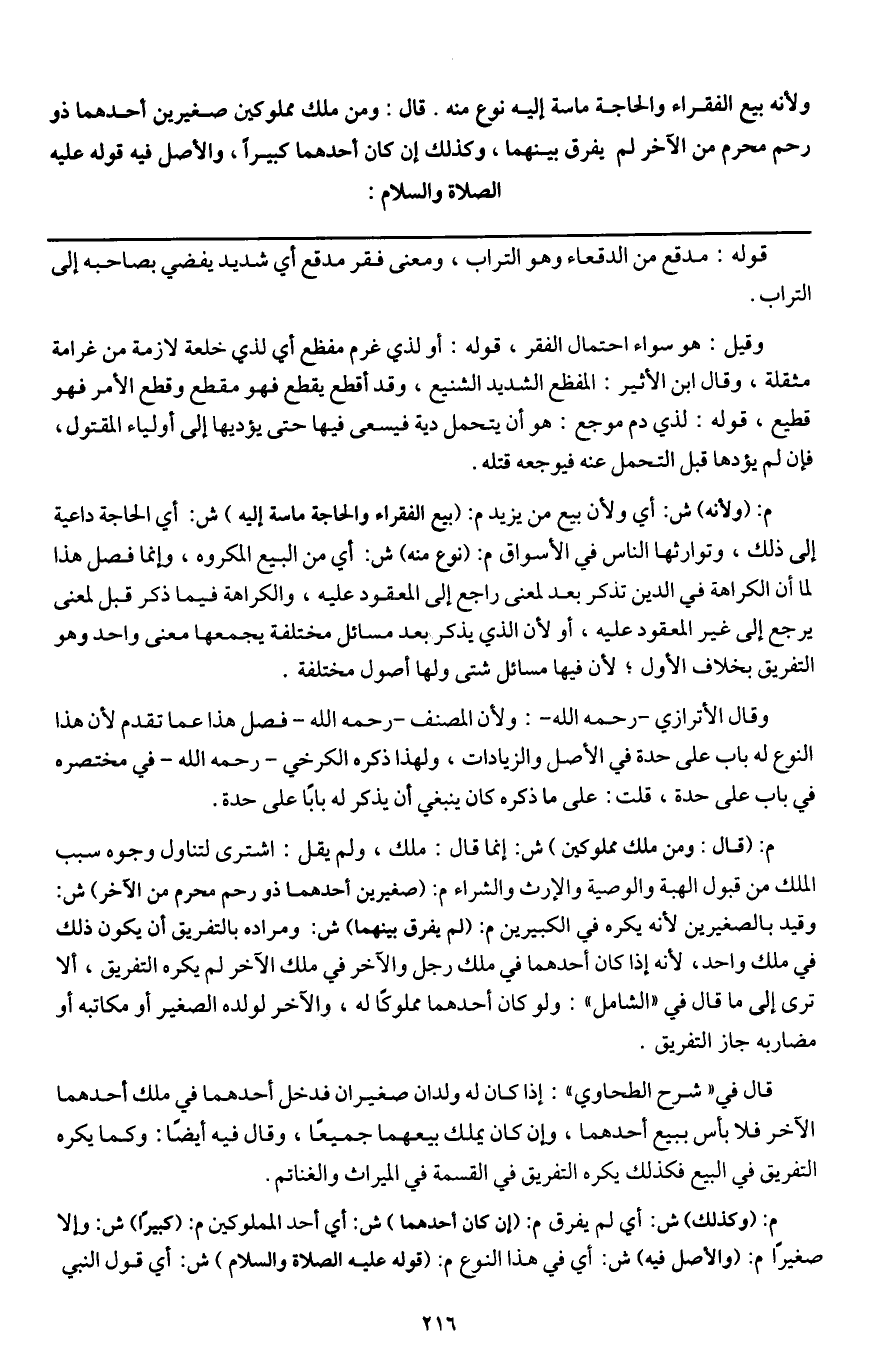 ولأنه بيع الفقراء والحاجة ماسة إليه نوع منه. قال: ومن ملك مملوكين صغيرين أحدهما ذو رحم محرم من الآخر لم يفرق بينهما، وكذلك إن كان أحدهما كبيرا، والأصل فيه قوله - عَلَيْهِ الصَّلَاةُ وَالسَّلَامُ -: