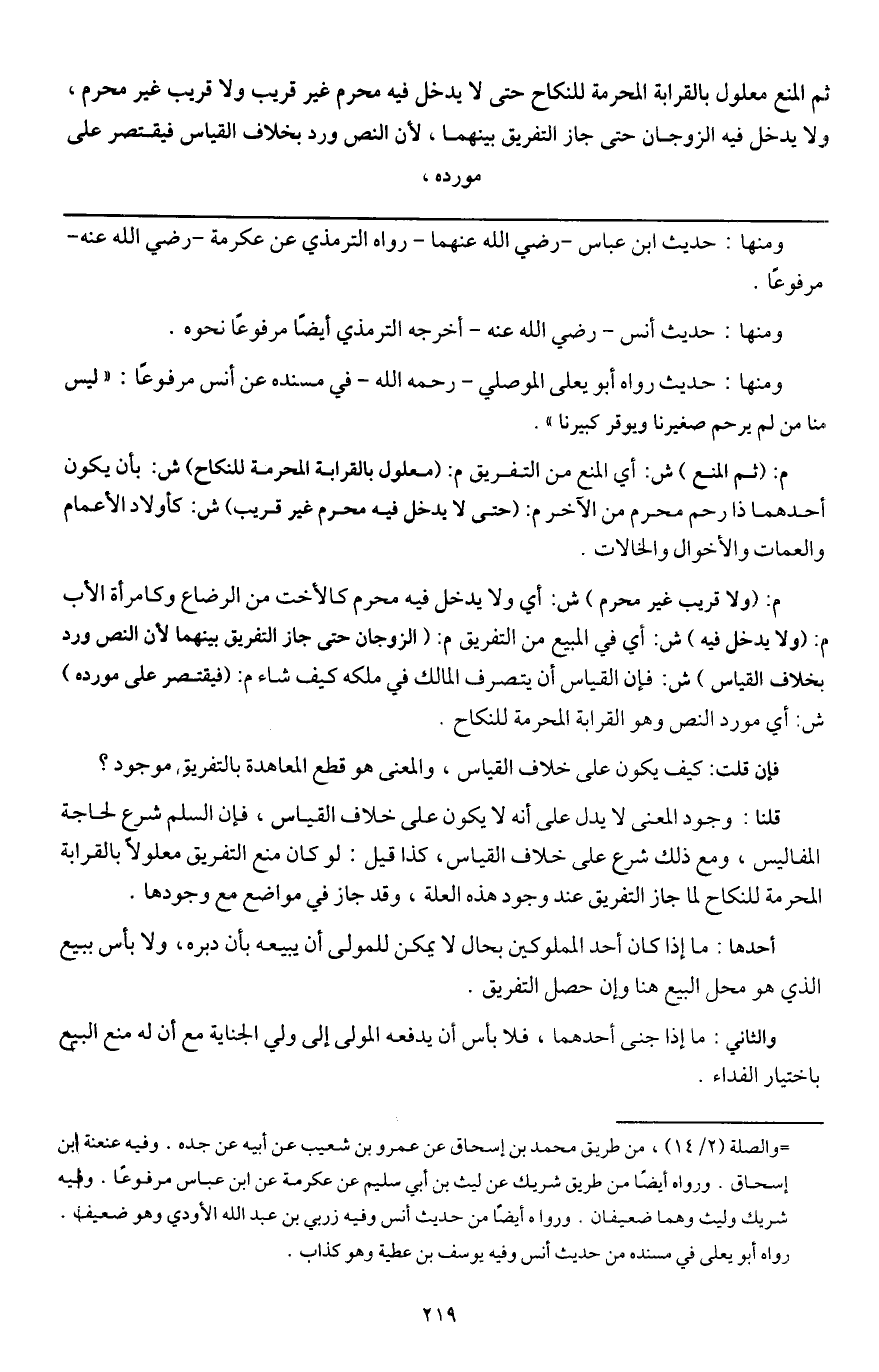 م: (ثم المنع) ش: أي المنع من التفريق م: (معلول بالقرابة المحرمة للنكاح) ش: بأن يكون أحدهما ذا رحم محرم من الآخر م: (حتى لا يدخل فيه محرم غير قريب) ش: كأولاد الأعمام والعمات والأخوال والخالات.