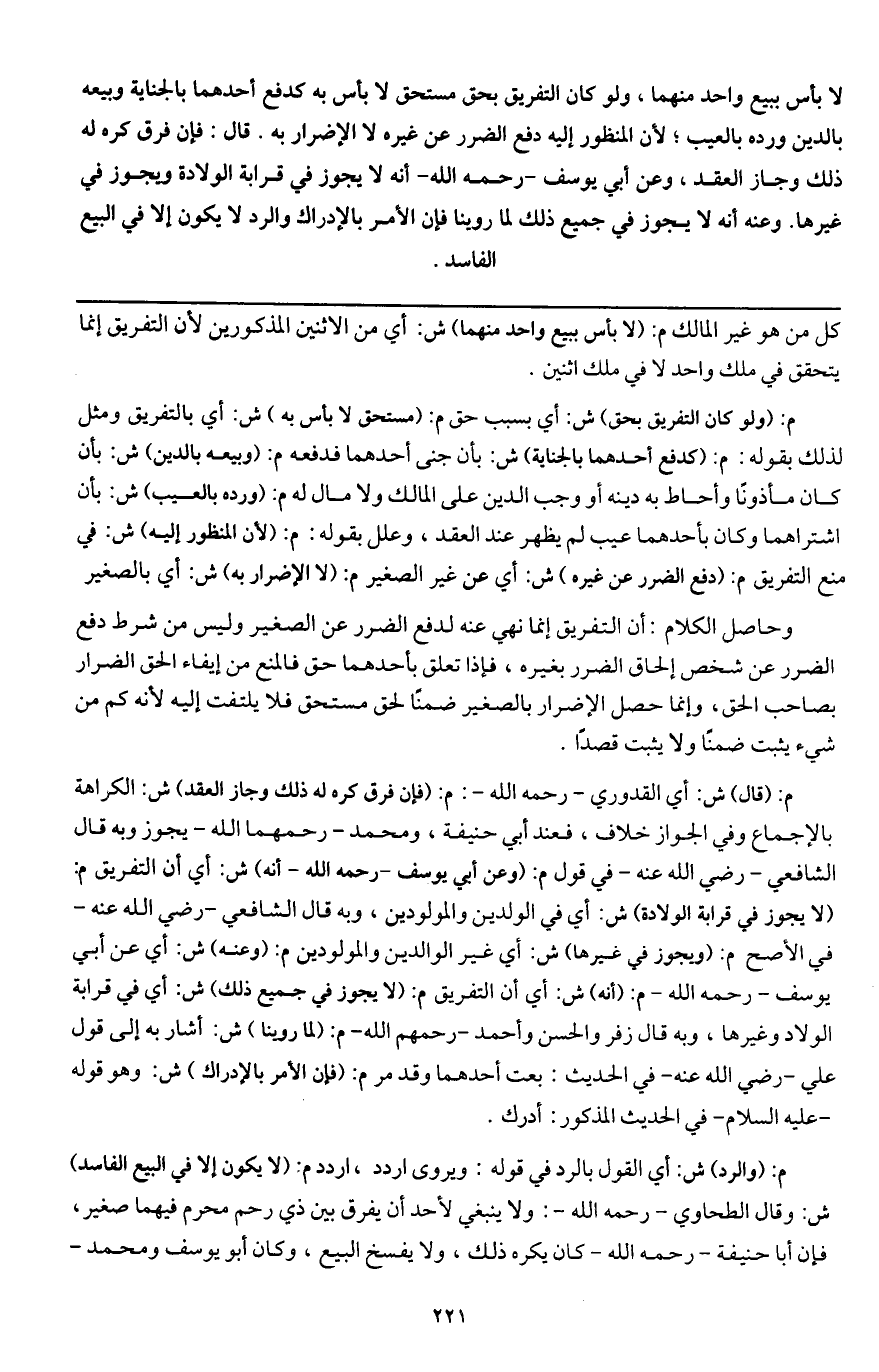 قال: فإن فرق كره له ذلك وجاز العقد، وعن أبي يوسف - رَحِمَهُ اللَّهُ - أنه لا يجوز في قرابة الولادة ويجوز في غيرها. وعنه أنه لا يجوز في جميع ذلك لما روينا، فإن الأمر بالإدراك والرد لا يكون إلا في البيع الفاسد.
