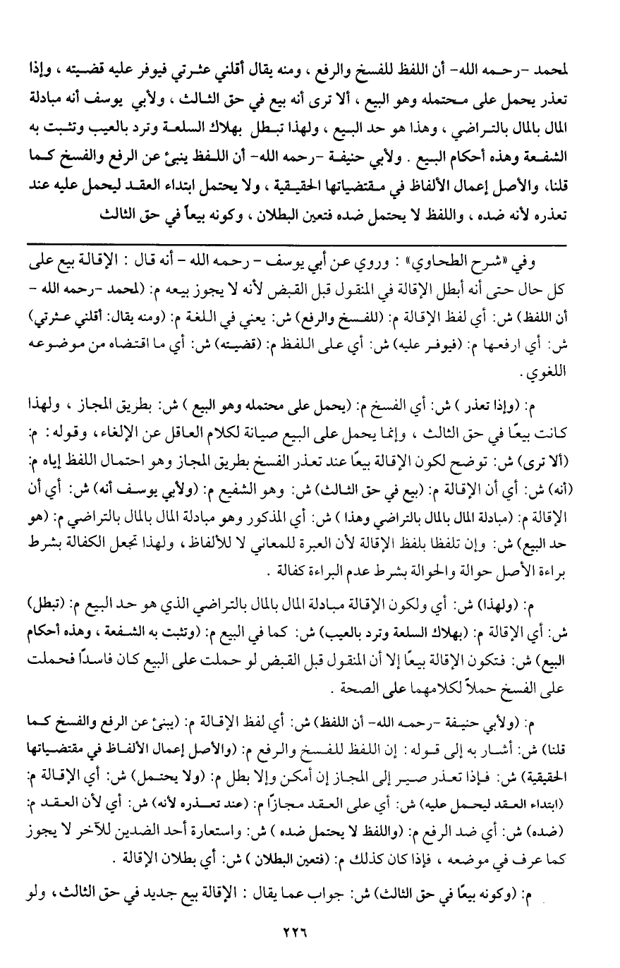 لمحمد - رَحِمَهُ اللَّهُ - أن اللفظ للفسخ والرفع، ومنه يقال أقلني عثرتي فيوفر عليه قضيته، وإذا تعذر يحمل على محتمله وهو البيع، ألا ترى أنه بيع في حق الثالث، ولأبي يوسف أنه مبادلة المال بالمال بالتراضي، وهذا هو حد البيع، ولهذا تبطل بهلاك السلعة وترد بالعيب وتثبت به الشفعة وهذه أحكام البيع. ولأبي حنيفة - رَحِمَهُ اللَّهُ - أن اللفظ ينبئ عن الرفع والفسخ كما قلنا، والأصل إعمال الألفاظ في مقتضياتها الحقيقية، ولا يحتمل ابتداء العقد ليحمل عليه عند تعذره لأنه ضده، واللفظ لا يحتمل ضده فتعين البطلان، وكونه بيعا في حق الثالث
