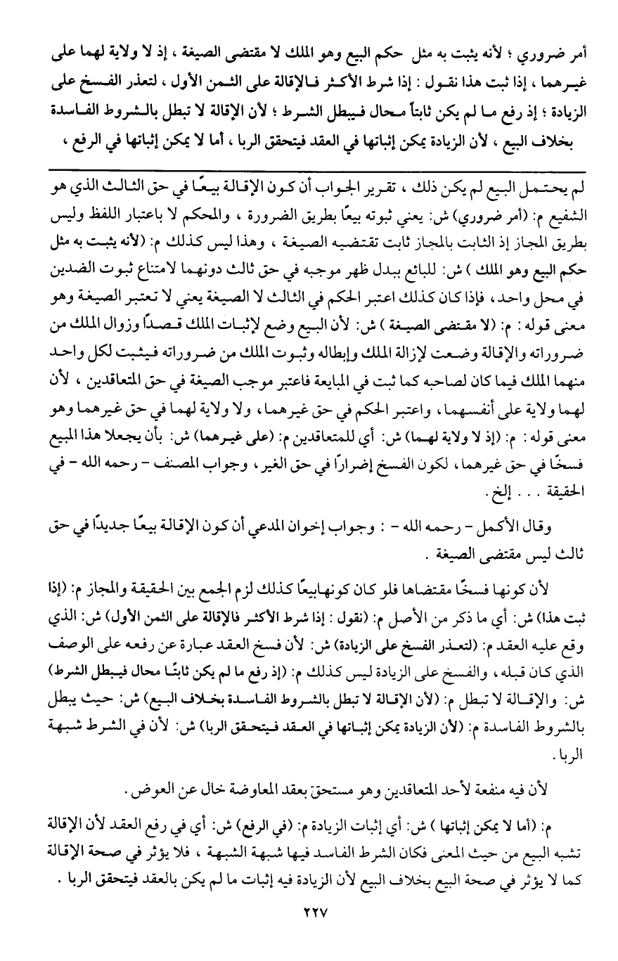 أمر ضروري؛ لأنه يثبت به مثل حكم البيع وهو الملك لا مقتضى الصيغة، إذ لا ولاية لهما على غيرهما، إذا ثبت هذا نقول: إذا شرط الأكثر فالإقالة على الثمن الأول، لتعذر الفسخ على الزيادة؛ إذ رفع ما لم يكن ثابتا محال فيبطل الشرط؛ لأن الإقالة لا تبطل بالشروط الفاسدة بخلاف البيع، لأن الزيادة يمكن إثباتها في العقد فيتحقق الربا، أما لا يمكن إثباتها في الرفع،