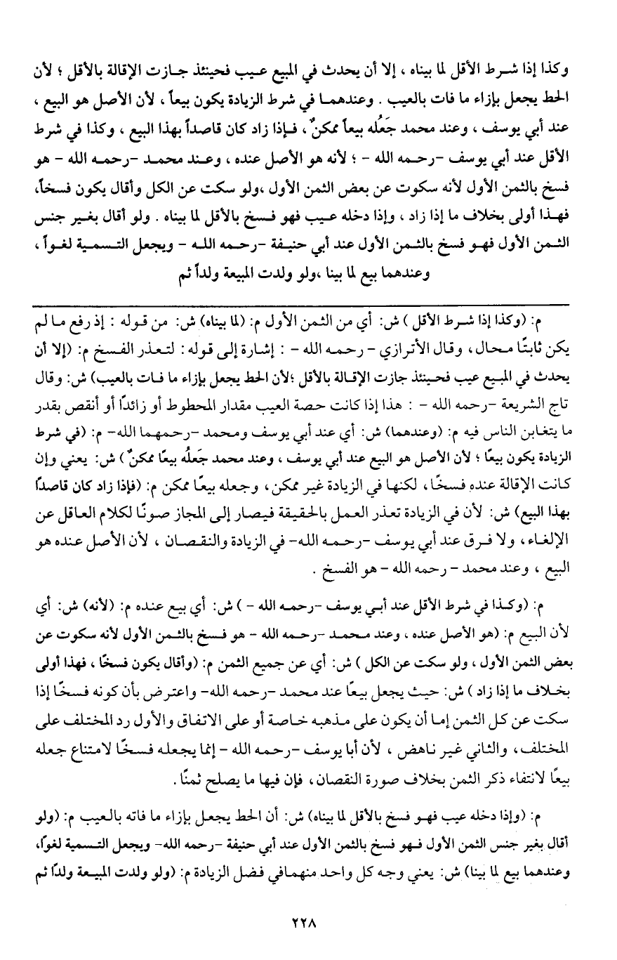 وكذا إذا شرط الأقل لما بيناه، إلا أن يحدث في المبيع عيب فحينئذ جازت الإقالة بالأقل؛ لأن الحط يجعل بإزاء ما فات بالعيب. وعندهما في شرط الزيادة يكون بيعا، لأن الأصل هو البيع، عند أبي يوسف، وعند محمد جعله بيعا ممكن، فإذا زاد كان قاصدا بهذا البيع، وكذا في شرط الأقل عند أبي يوسف - رَحِمَهُ اللَّهُ -؛ لأنه هو الأصل عنده، وعند محمد - رَحِمَهُ اللَّهُ - هو فسخ بالثمن الأول لأنه سكوت عن بعض الثمن الأول، ولو سكت عن الكل وأقال يكون فسخا، فهذا أولى بخلاف ما إذا زاد، وإذا دخله عيب فهو فسخ بالأقل لما بيناه. ولو أقال بغير جنس الثمن الأول فهو فسخ بالثمن الأول عند أبي حنيفة - رَحِمَهُ اللَّهُ - ويجعل التسمية لغوا، وعندهما بيع لما بينا، ولو ولدت المبيعة ولدا ثم