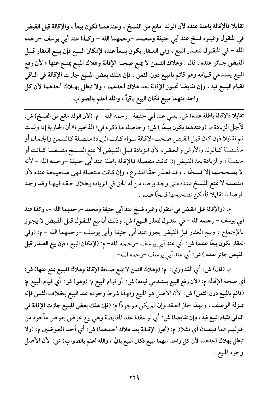 قال: وهلاك الثمن لا يمنع صحة الإقالة وهلاك المبيع يمنع عنها؛ لأن رفع البيع يستدعي قيامه وهو قائم بالمبيع دون الثمن، فإن هلك بعض المبيع جازت الإقالة في الباقي لقيام البيع فيه، وإن تقايضا تجوز الإقالة بعد هلاك أحدهما، ولا تبطل بهلاك أحدهما لأن كل واحد منهما مبيع فكان البيع باقيا، والله أعلم بالصواب.