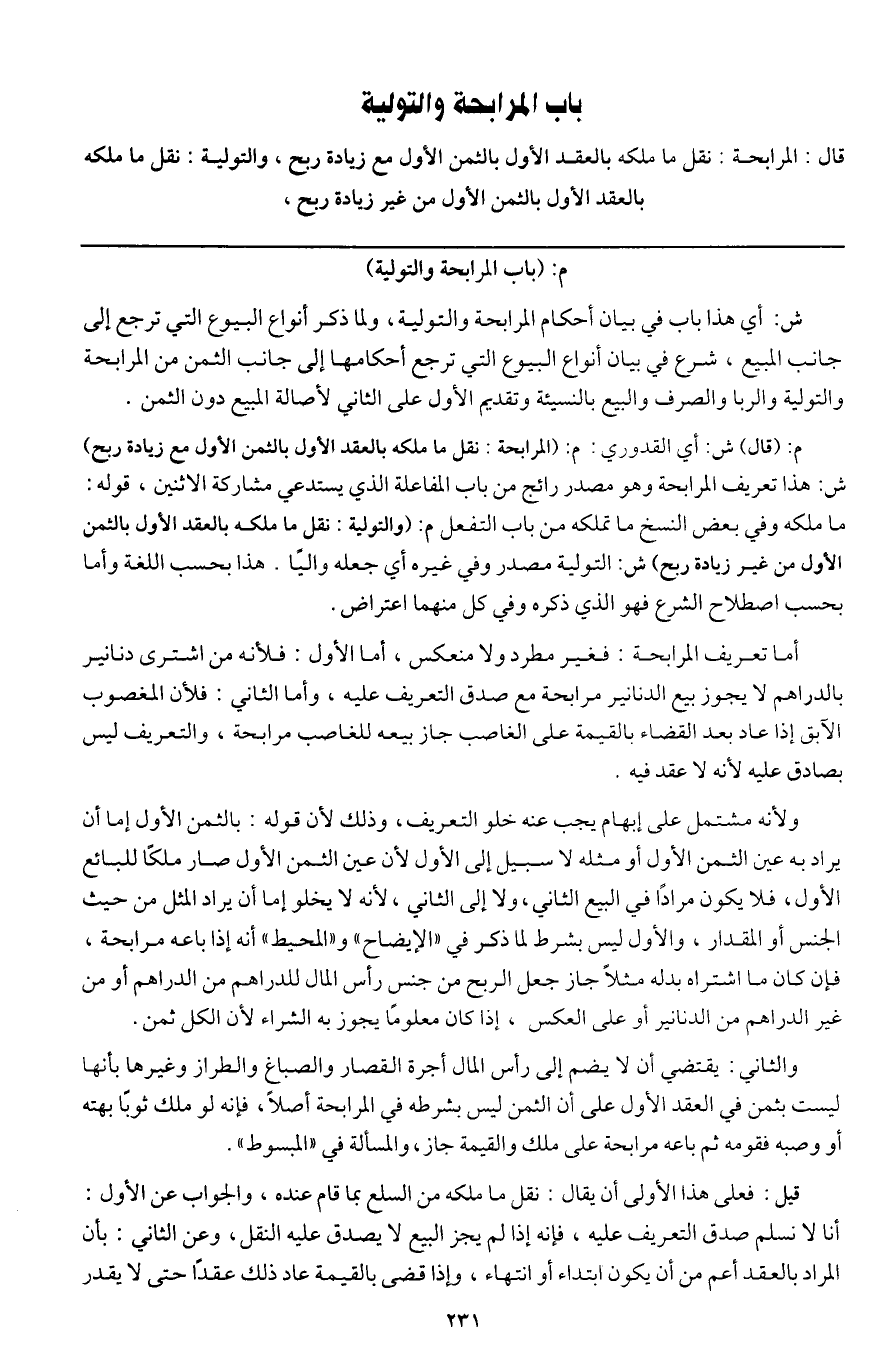 ش: أي هذا باب في بيان أحكام المرابحة والتولية، ولما ذكر أنواع البيوع التي ترجع إلى جانب المبيع، شرع في بيان أنواع البيوع التي ترجع أحكامها إلى جانب الثمن من المرابحة والتولية والربا والصرف والبيع بالنسيئة وتقديم الأول على الثاني لأصالة المبيع دون الثمن.