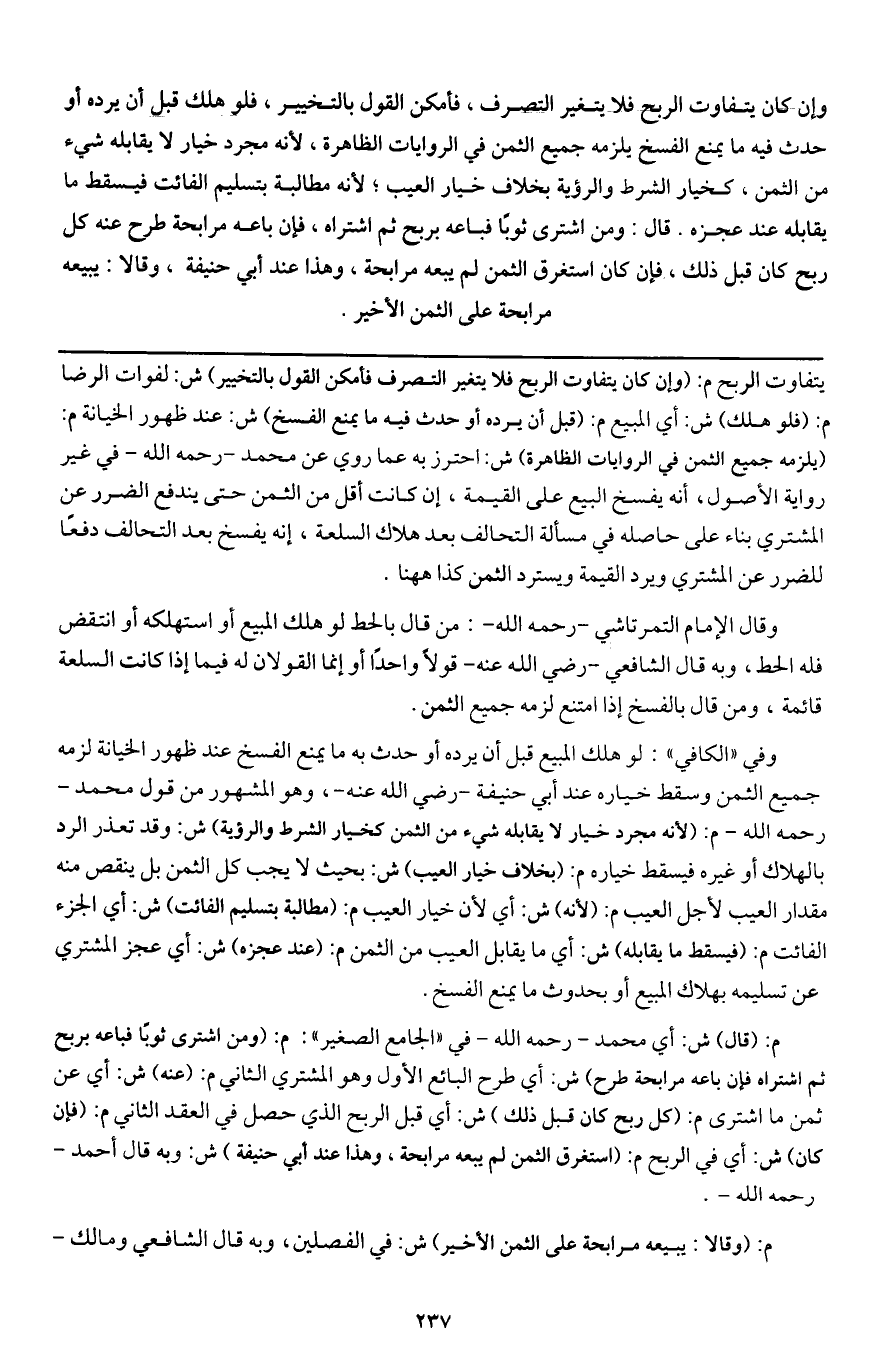 وإن كان يتفاوت الربح فلا يتغير التصرف، فأمكن القول بالتخيير، فلو هلك قبل أن يرده أو حدث فيه ما يمنع الفسخ يلزمه جميع الثمن في الروايات الظاهرة، لأنه مجرد خيار لا يقابله شيء من الثمن، كخيار الشرط والرؤية بخلاف خيار العيب؛ لأنه مطالبة بتسليم الفائت فيسقط ما يقابله عند عجزه