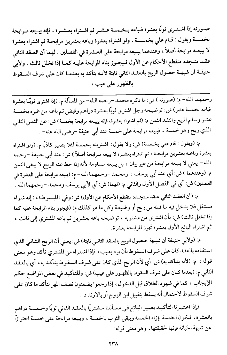 صورته إذا اشترى ثوبا بعشرة فباعه بخمسة عشر ثم اشتراه بعشرة، فإنه يبيعه مرابحة بخمسة ويقول: قام علي بخمسة، ولو اشتراه بعشرة وباعه بعشرين مرابحة ثم اشتراه بعشرة لا يبيعه مرابحة أصلا، وعندهما يبيعه مرابحة على العشرة في الفصلين. لهما أن العقد الثاني عقد متجدد منقطع الأحكام عن الأول فيجوز بناء المرابحة عليه كما إذا تخلل ثالث. ولأبي حنيفة أن شبهة حصول الربح بالعقد الثاني ثابتة لأنه يتأكد به بعدما كان على شرف السقوط بالظهور على عيب،