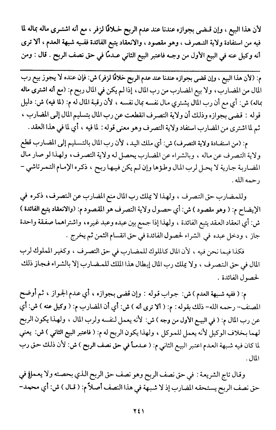 لأن هذا البيع، وإن قضى بجوازه عندنا عند عدم الربح خلافا لزفر، مع أنه اشترى ماله بماله لما فيه من استفادة ولاية التصرف، وهو مقصود، والانعقاد يتبع الفائدة ففيه شبهة العدم، ألا ترى أنه وكيل عنه في البيع الأول من وجه فاعتبر البيع الثاني عدما في حق نصف الربح.