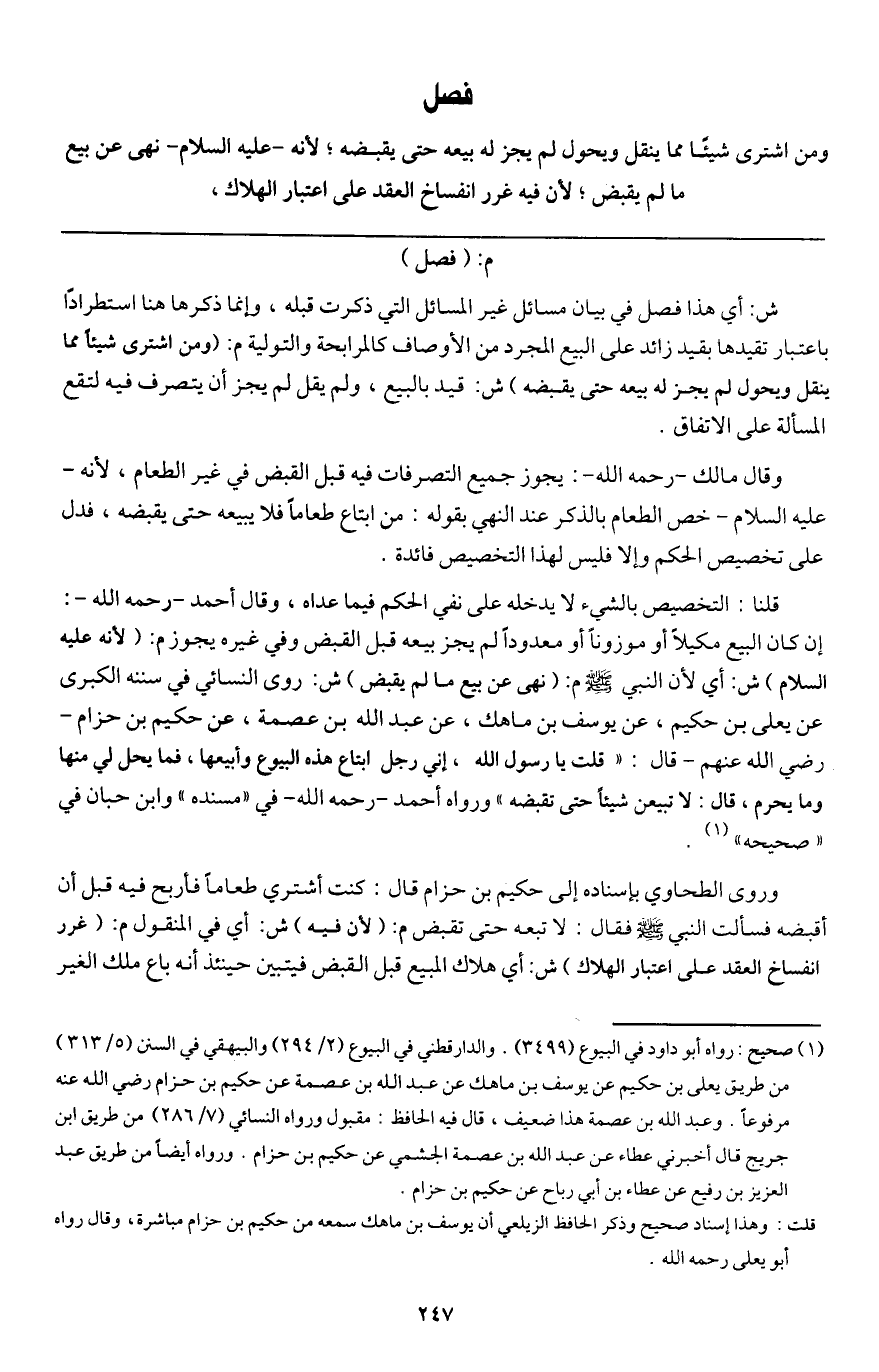 وروى الطحاوي بإسناده إلى «حكيم بن حزام قال: كنت أشتري طعاما فأربح فيه قبل أن أقبضه فسألت النبي صلى الله عيه وسلم فقال: لا تبعه حتى تقبض» م: (لأن فيه) ش: أي في المنقول م: (غرر انفساخ العقد على اعتبار الهلاك) ش: أي هلاك المبيع قبل القبض فيتبين حينئذ أنه باع ملك الغير