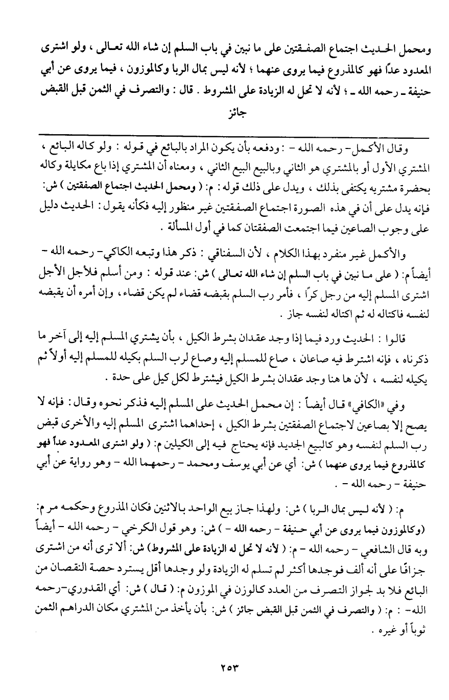 وفي " الكافي " قال أيضا: إن محمل الحديث على المسلم إليه فذكر نحوه وقال: فإنه لا يصح إلا بصاعين لاجتماع الصفقتين بشرط الكيل، إحداهما اشترى المسلم إليه والأخرى قبض رب السلم لنفسه وهو كالبيع الجديد فإنه يحتاج فيه إلى الكيلين م: (ولو اشترى المعدود عدا فهو كالمذروع فيما يروى عنهما) ش: أي عن أبي يوسف ومحمد - رحمهما الله - وهو رواية عن أبي حنيفة - رَحِمَهُ اللَّهُ -.