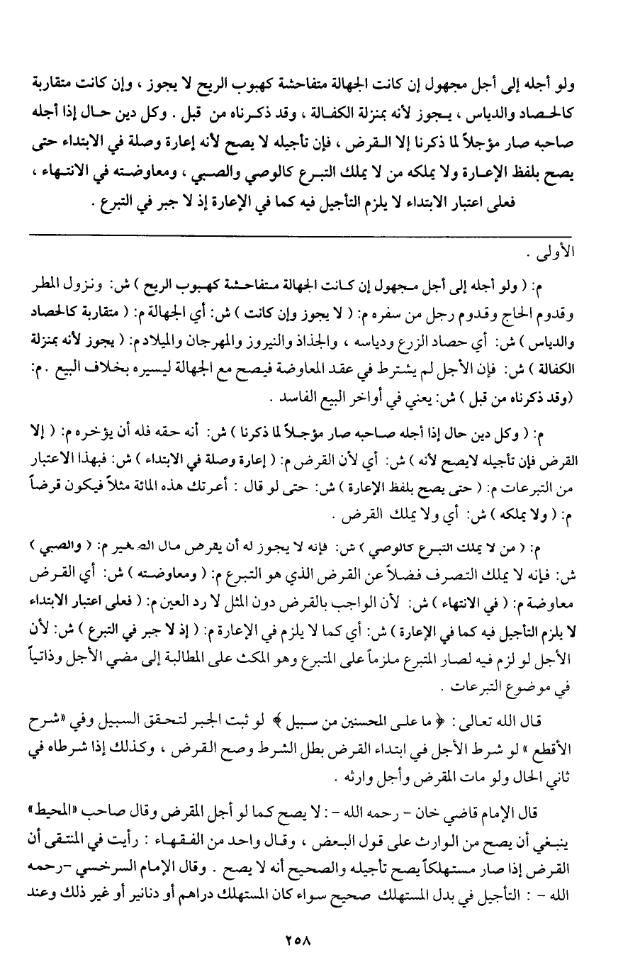 قال الله تعالى: {مَا عَلَى الْمُحْسِنِينَ مِنْ سَبِيلٍ} [التوبة: 91] لو ثبت الجبر لتحقق السبيل وفي " شرح الأقطع " لو شرط الأجل في ابتداء القرض بطل الشرط وصح القرض، وكذلك إذا شرطاه في ثاني الحال ولو مات المقرض وأجل وارثه.