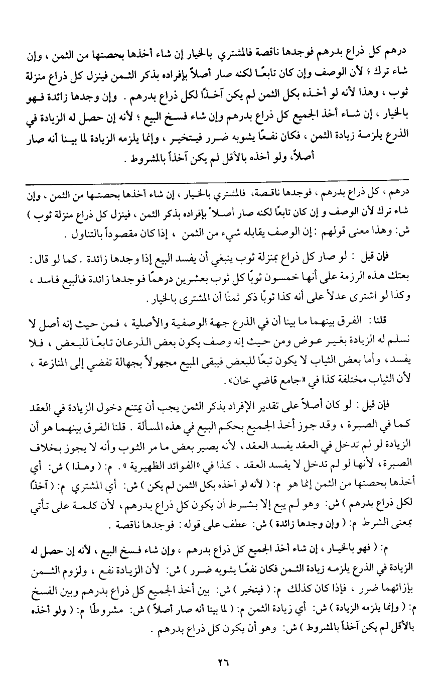 درهم كل ذراع بدرهم فوجدها ناقصة فالمشتري بالخيار: إن شاء أخذها بحصتها من الثمن، وإن شاء ترك؛ لأن الوصف وإن كان تابعا لكنه صار أصلا بإفراده بذكر الثمن، فينزل كل ذراع منزلة ثوب، وهذا؛ لأنه لو أخذه بكل الثمن لم يكن آخذا لكل ذراع بدرهم. وإن وجدها زائدة فهو بالخيار: إن شاء أخذ الجميع كل ذراع بدرهم، وإن شاء فسخ البيع؛ لأنه إن حصل له الزيادة في الذرع يلزمه زيادة الثمن، فكان نفعا يشوبه ضرر فيتخير، وإنما يلزمه الزيادة لما بينا أنه صار أصلا، ولو أخذه بالأقل لم يكن آخذا بالمشروط.