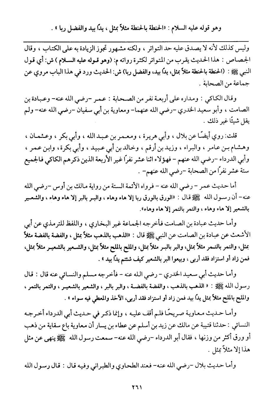 أما حديث عمر - رَضِيَ اللَّهُ عَنْهُ - فرواه الأئمة الستة من رواية مالك بن أوس - رَضِيَ اللَّهُ عَنْهُ - أن رسول الله - صَلَّى اللَّهُ عَلَيْهِ وَسَلَّمَ - قال: «الورق بالورق ربا إلا هاء وهاء، والبر بالبر إلا هاء وهاء، والشعير بالشعير إلا هاء وهاء، والتمر بالتمر إلا هاء وهاء» .
