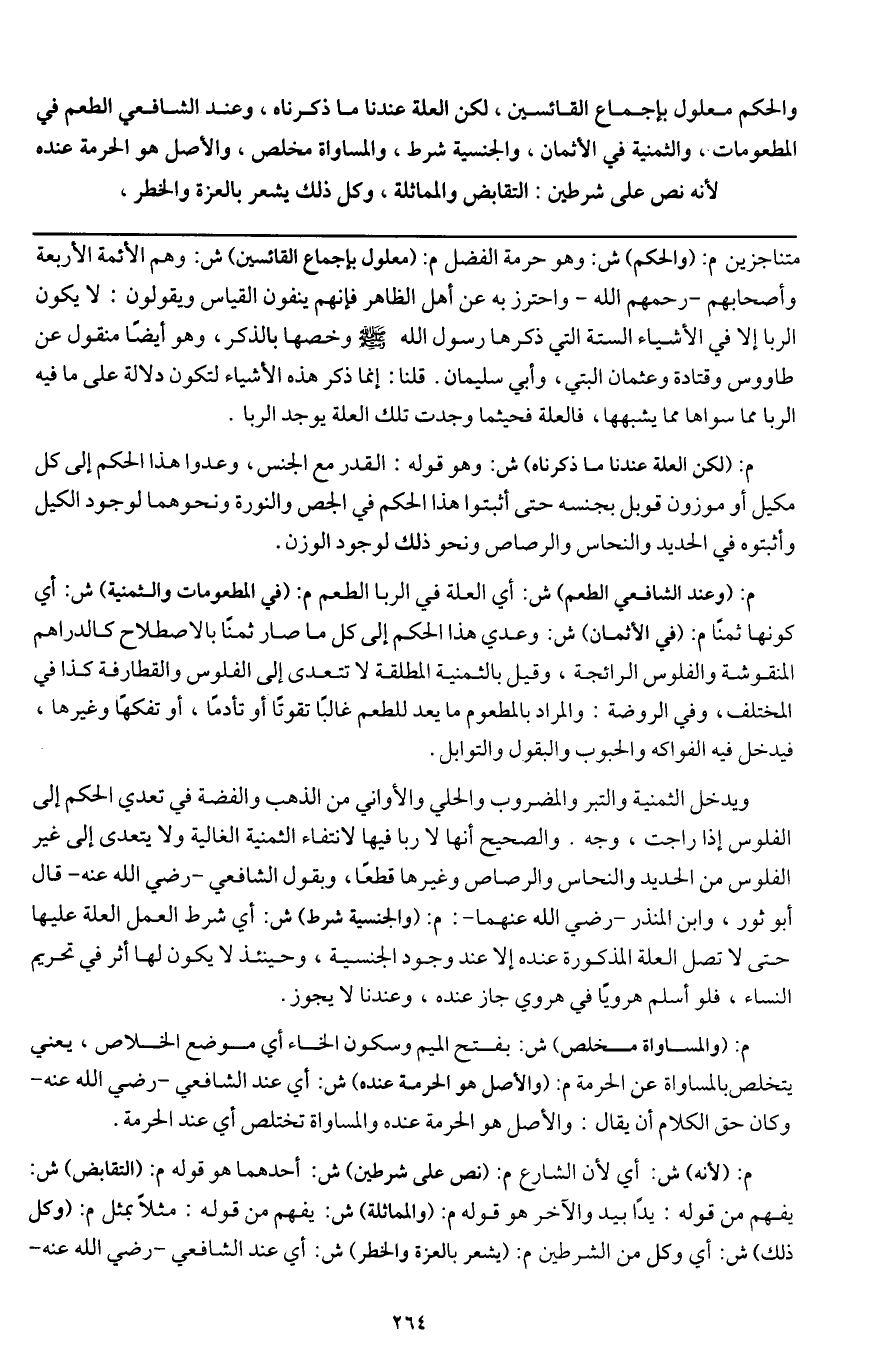 والحكم معلول بإجماع القائسين، لكن العلة عندنا ما ذكرناه، وعند الشافعي الطعم في المطعومات، والثمنية في الأثمان، والجنسية شرط، والمساواة مخلص، والأصل هو الحرمة عنده لأنه نص على شرطين: التقابض والمماثلة، وكل ذلك يشعر بالعزة والخطر،