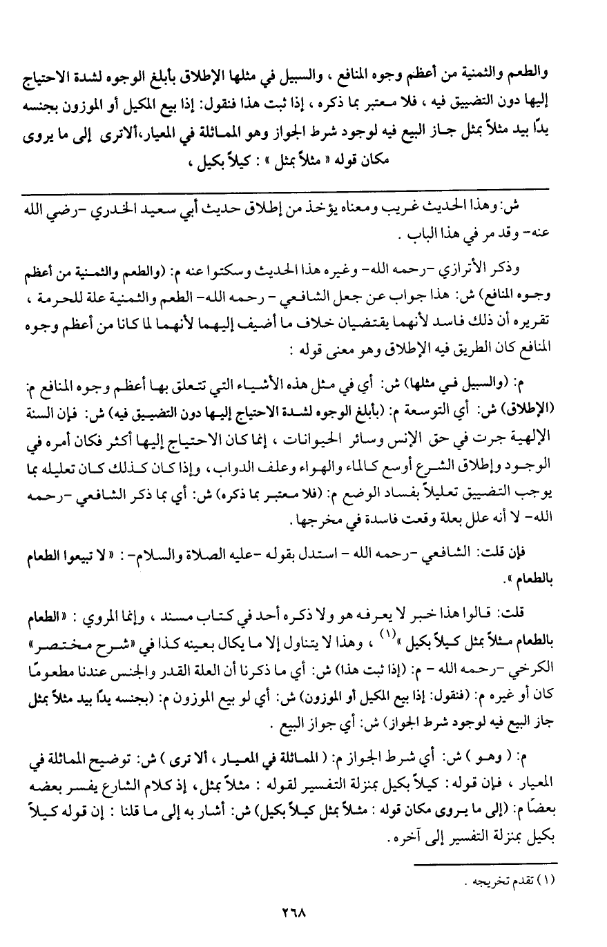 والطعم والثمنية من أعظم وجوه المنافع، والسبيل في مثلها الإطلاق بأبلغ الوجوه لشدة الاحتياج إليها دون التضييق فيه، فلا معتبر بما ذكره، إذا ثبت هذا فنقول: إذا بيع المكيل أو الموزون بجنسه يدا بيد مثلا بمثل جاز البيع فيه لوجود شرط الجواز وهو المماثلة في المعيار، ألا ترى إلى ما يروى مكان قوله "مثلا بمثل": كيلا بكيل،