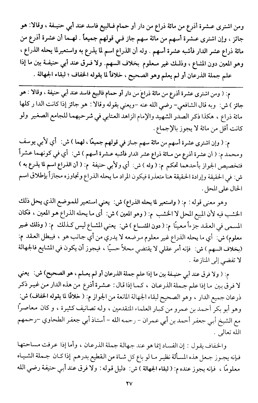 ومن اشترى عشرة أذرع من مائة ذراع من دار أو حمام فالبيع فاسد عند أبي حنيفة، وقالا: هو جائز، وإن اشترى عشرة أسهم من مائة سهم جاز في قولهم جميعا، لهما أن عشرة أذرع من مائة ذراع عشر الدار فأشبه عشرة أسهم، وله أن الذراع اسم لما يذرع به، واستعير لما يحله الذراع، وهو المعين دون المشاع، وذلك غير معلوم بخلاف السهم. ولا فرق عند أبي حنيفة بين ما إذا علم جملة الذرعان، أو لم يعلم وهو الصحيح، خلافا لما يقوله الخفاف، لبقاء الجهالة.
