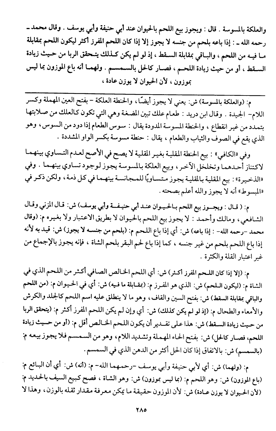 والعلكة بالمسوسة. قال: ويجوز بيع اللحم بالحيوان عند أبي حنيفة وأبي يوسف. وقال محمد - رَحِمَهُ اللَّهُ -: إذا باعه بلحم من جنسه لا يجوز إلا إذا كان اللحم المفرز أكثر ليكون اللحم بمقابلة ما فيه من اللحم، والباقي بمقابلة السقط، إذ لو لم يكن كذلك يتحقق الربا من حيث زيادة السقط، أو من حيث زيادة اللحم، فصار كالحل بالسمسم. ولهما أنه باع الموزون بما ليس بموزون، لأن الحيوان لا يوزن عادة،