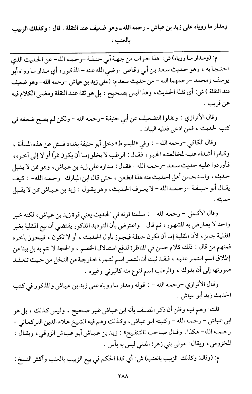 وقال الكاكي - رَحِمَهُ اللَّهُ -: وفي " المبسوط " دخل أبو حنيفة بغداد فسئل عن هذه المسألة، وكانوا أشداء عليه لمخالفته الخبر، فقال: الرطب لا يخلو إما أن يكون تمرا أو لا إلى آخره، فأوردوا عليه حديث سعد - رَحِمَهُ اللَّهُ - فقال: مداره على زيد بن عياش، وهو ممن لا يقبل حديثه، واستحسن أهل الحديث منه هذا الطعن، حتى قال ابن المبارك - رَحِمَهُ اللَّهُ -: كيف يقال أبو حنيفة - رَحِمَهُ اللَّهُ - لا يعرف الحديث، وهو يقول: زيد بن عياش ممن لا يقبل حديثه.