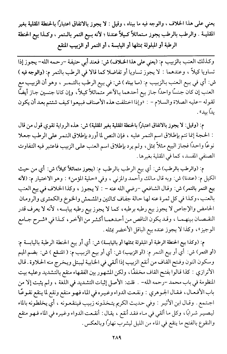 وكذا بيع الحنطة الرطبة أو المبلولة بمثلها أو اليابسة، أو التمر أو الزبيب المنقع