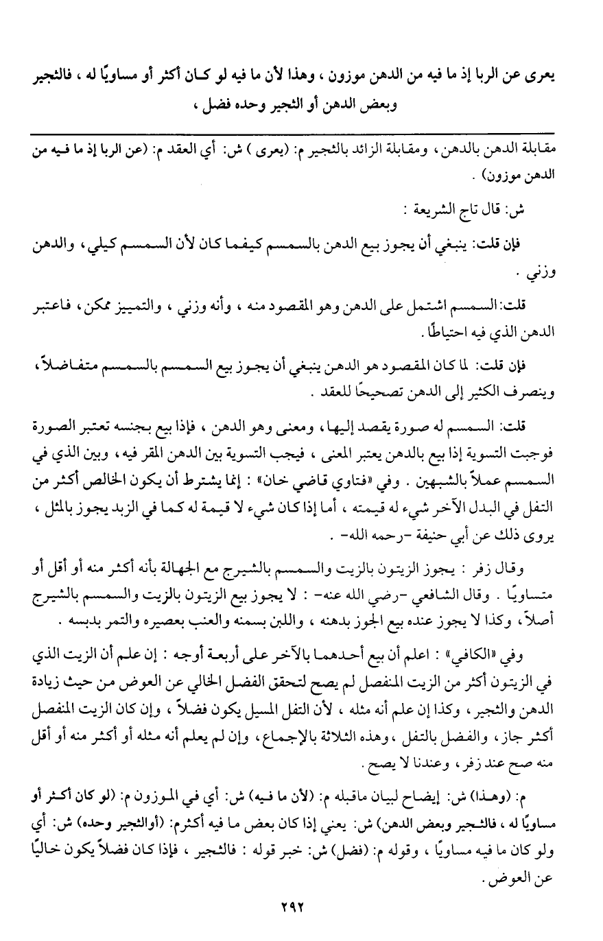 ـــــــــــــــــــــــــــــQمقابلة الدهن بالدهن، ومقابلة الزائد بالثجير م: (يعرى) ش: أي العقد م: (عن الربا إذ ما فيه من الدهن موزون) .