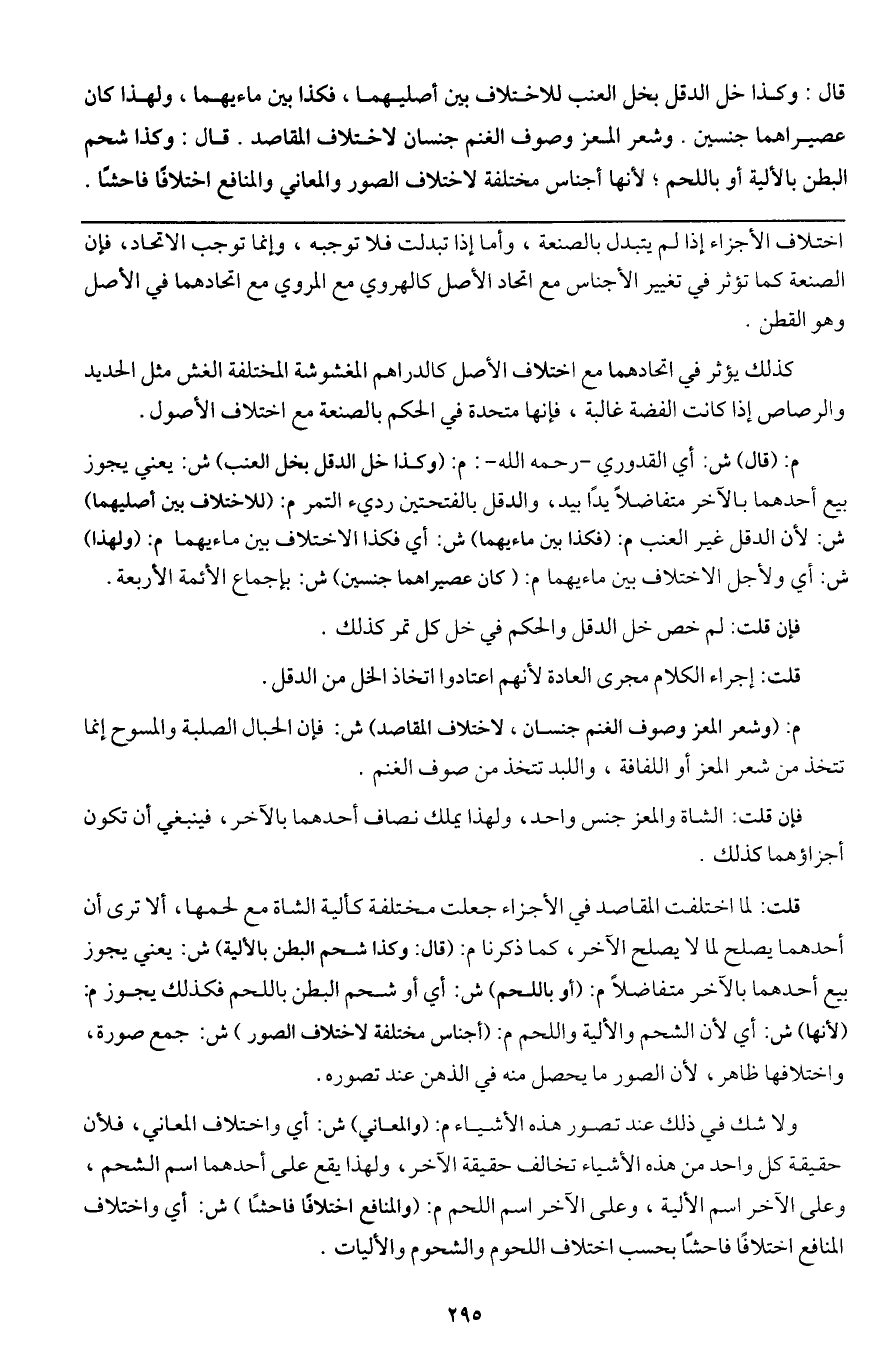 قال: وكذا خل الدقل بخل العنب للاختلاف بين أصليهما، فكذا بين ماءيهما، ولهذا كان عصيراهما جنسين، وشعر المعز وصوف الغنم جنسان لاختلاف المقاصد. قال: وكذا شحم البطن بالألية أو باللحم؛ لأنها أجناس مختلفة لاختلاف الصور والمعاني والمنافع اختلافا فاحشا.