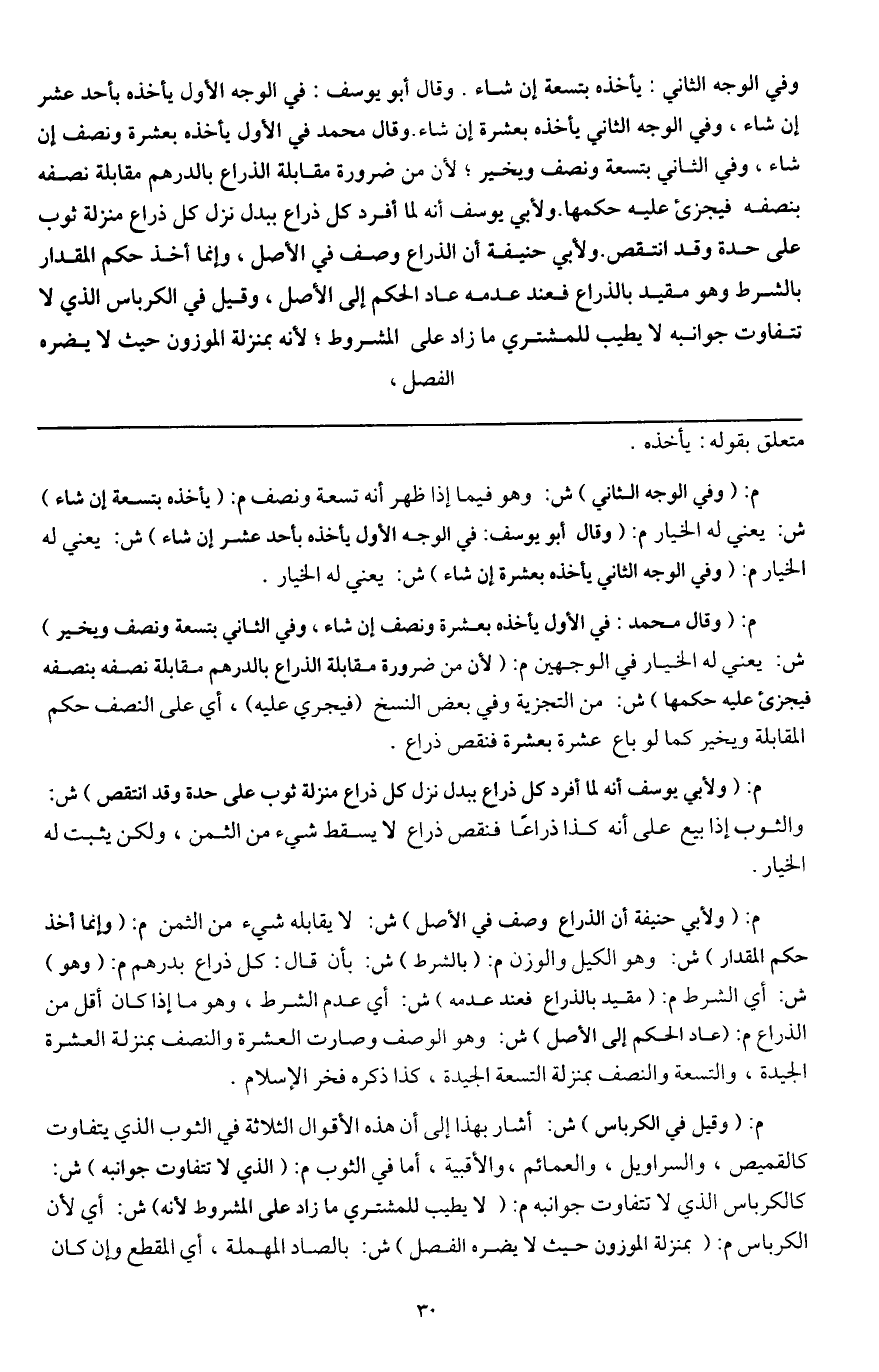 وفي الوجه الثاني: يأخذه بتسعة إن شاء. وقال أبو يوسف: في الوجه الأول يأخذه بأحد عشر إن شاء، وفي الوجه الثاني يأخذه بعشرة إن شاء. وقال محمد في الأول يأخذه بعشرة ونصف إن شاء، وفي الثاني بتسعة ونصف ويخير؛ لأن من ضرورة مقابلة الذراع بالدرهم مقابلة نصفه بنصفه فيجزئ عليه حكمها. ولأبي يوسف أنه لما أفرد كل ذراع ببدل نزل كل ذراع منزلة ثوب على حدة وقد انتقص. ولأبي حنيفة أن الذراع وصف في الأصل، وإنما أخذ حكم المقدار بالشرط وهو مقيد بالذراع فعند عدمه عاد الحكم إلى الأصل، وقيل في الكرباس الذي لا تتفاوت جوانبه: لا يطيب للمشتري ما زاد على المشروط؛ لأنه بمنزلة الموزون حيث لا يضره الفصل