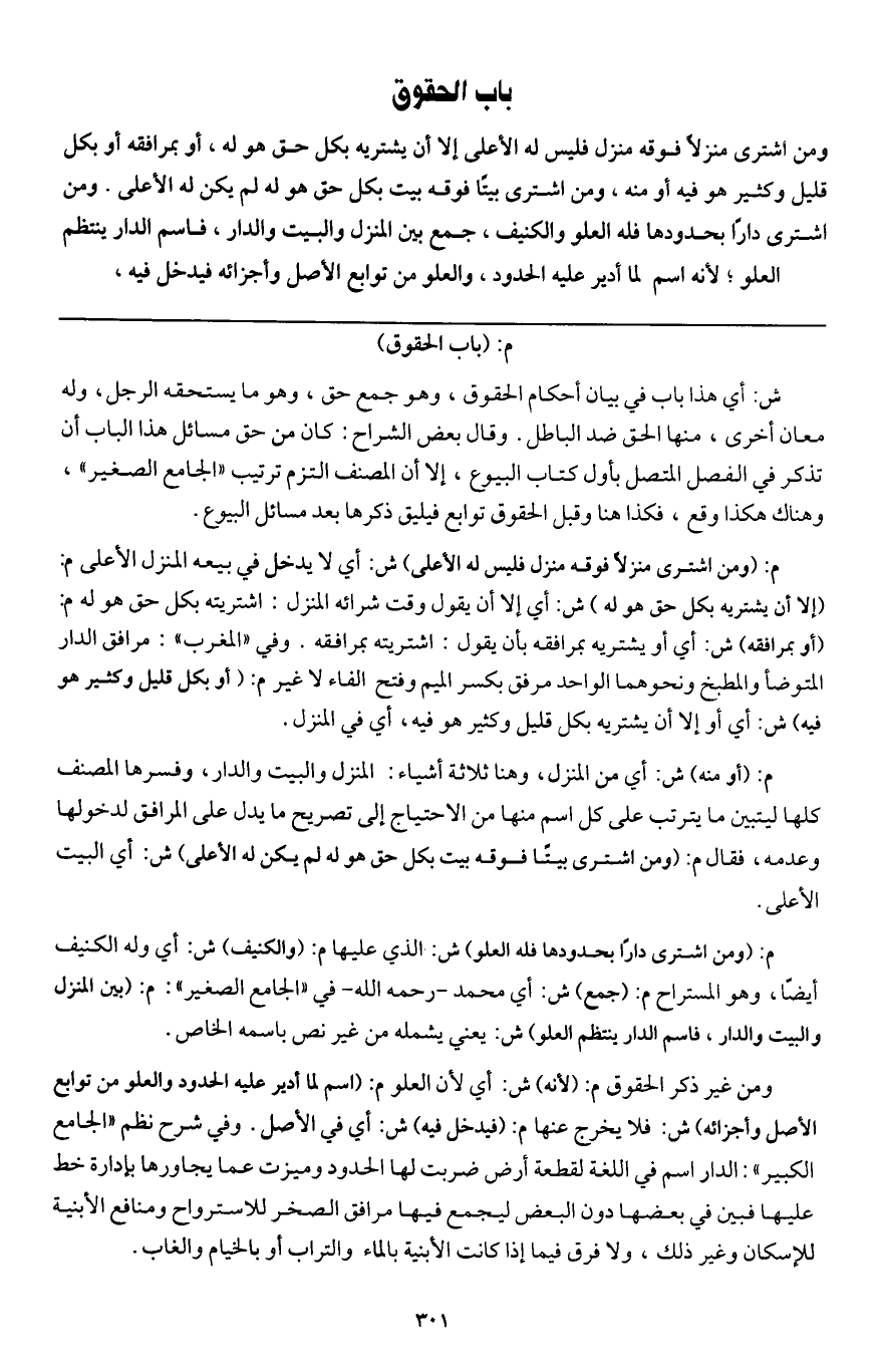 باب الحقوق ومن اشترى منزلا فوقه منزل فليس له الأعلى إلا أن يشتريه بكل حق هو له أو بمرافقه أو بكل قليل وكثير هو فيه أو منه ومن اشترى بيتا فوقه بيت بكل حق هو له لم يكن له الأعلى ومن اشترى دارا بحدودها فله العلو والكنيف جمع بين المنزل والبيت والدار، فاسم الدار ينتظم العلو لأنه اسم لما أدير عليه الحدود والعلو من توابع الأصل وأجزائه فيدخل فيه