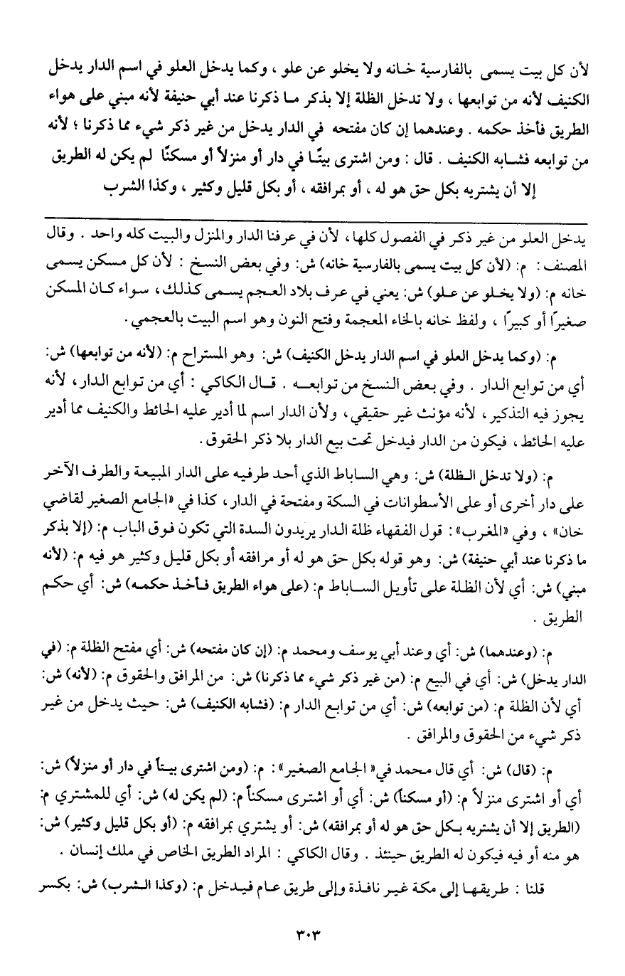 م: (وكما يدخل العلو في اسم الدار يدخل الكنيف) ش: وهو المستراح م: (لأنه من توابعها) ش: أي من توابع الدار. وفي بعض النسخ من توابعه. قال الكاكي: أي من توابع الدار؛ لأنه يجوز فيه التذكير؛ لأنه مؤنث غير حقيقي، ولأن الدار اسم لما أدير عليه الحائط والكنيف مما أدير عليه الحائط، فيكون من الدار فيدخل تحت بيع الدار بلا ذكر الحقوق.