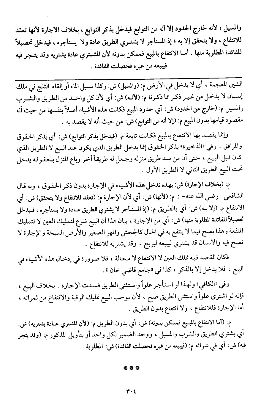 والمسيل؛ لأنه خارج الحدود إلا أنه من التوابع فيدخل بذكر التوابع، بخلاف الإجارة لأنها تعقد للانتفاع، ولا يتحقق إلا به؛ إذ المستأجر لا يشتري الطريق عادة ولا يستأجره، فيدخل تحصيلا للفائدة المطلوبة منها. أما الانتفاع بالمبيع فممكن بدونه لأن المشتري عادة يشتريه وقد يتجر فيه فيبيعه من غيره فحصلت الفائدة.
