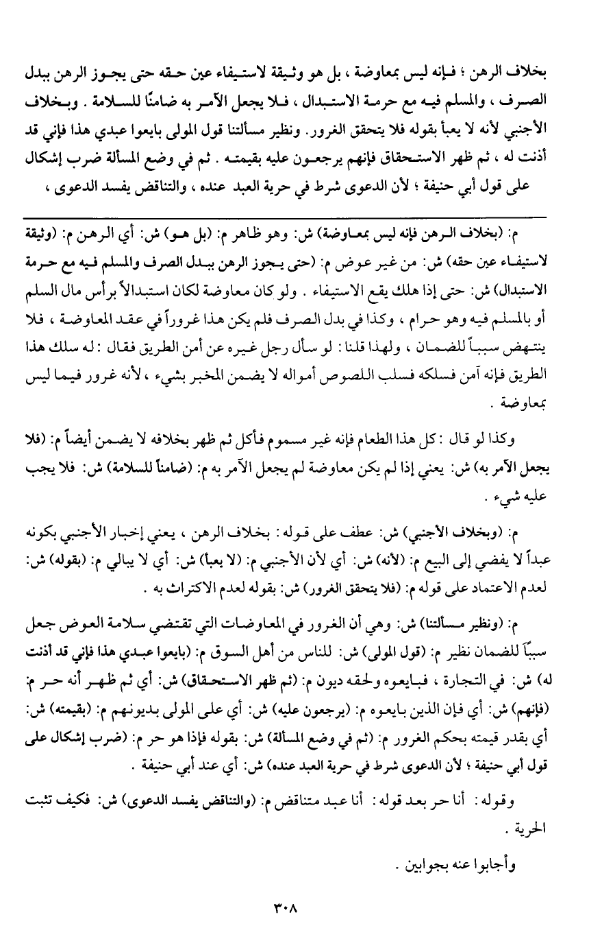 ـــــــــــــــــــــــــــــQم: (بخلاف الرهن فإنه ليس بمعاوضة) ش: وهو ظاهر م: (بل هو) ش: أي الرهن م: (وثيقة لاسيتفاء عين حقه) ش: من غير عوض م: (حتى يجوز الرهن ببدل الصرف والمسلم فيه مع حرمة الاستبدال) ش: حتى إذا هلك يقع الاستيفاء. ولو كان معاوضة لكان استبدالا برأس مال السلم أو بالمسلم فيه وهو حرام، وكذا في بدل الصرف فلم يكن هذا غرورا في عقد المعاوضة، فلا ينتهض سببا للضمان، ولهذا قلنا: لو سأل رجل غيره عن أمن الطريق فقال: له اسلك هذا الطريق فإنه آمن فسلكه فسلب اللصوص أمواله لا يضمن المخبر بشيء؛ لأنه غرور فيما ليس بمعاوضة.