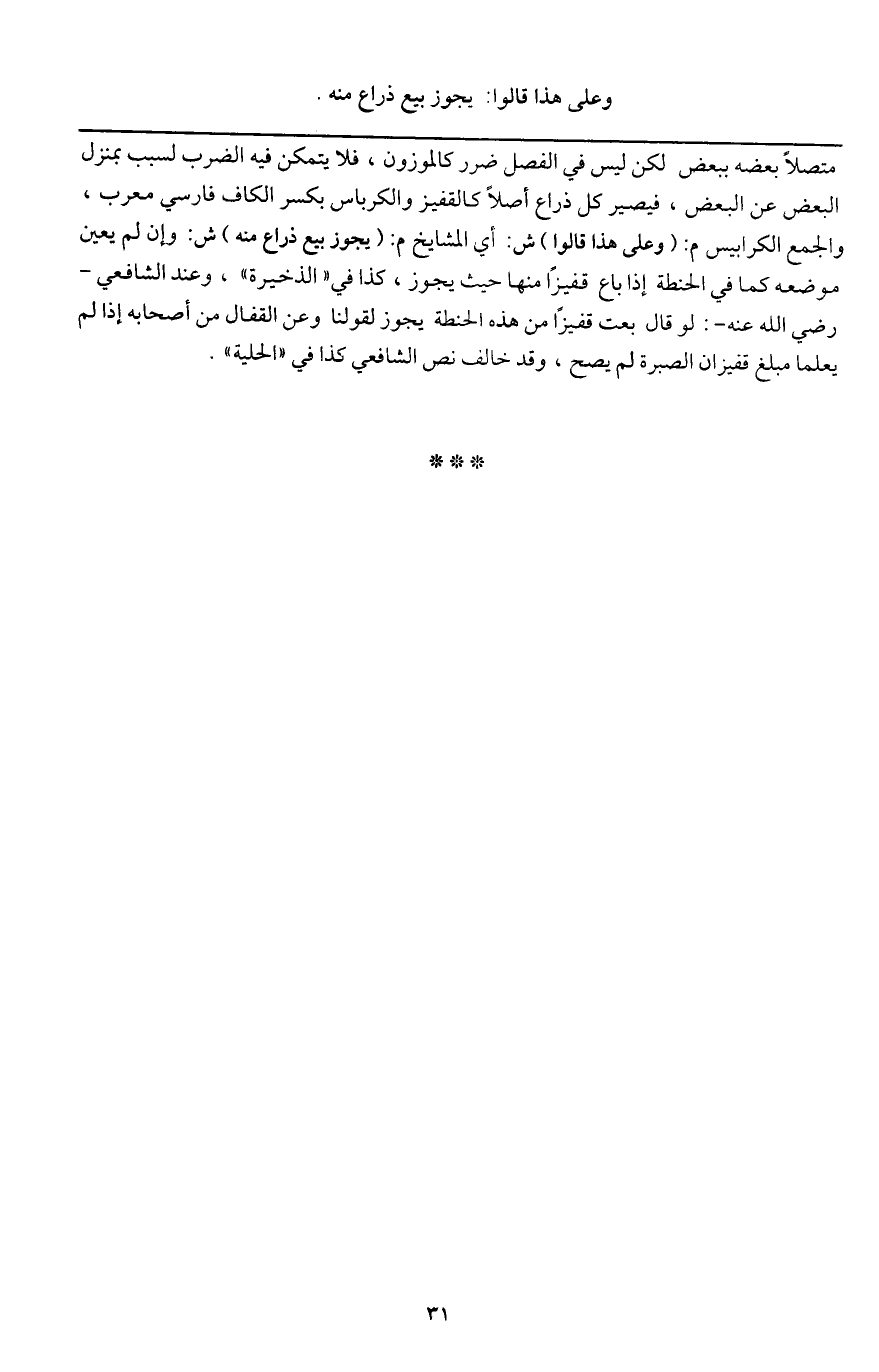 ـــــــــــــــــــــــــــــQمتصلا بعضه ببعض لكن ليس في الفصل ضرر كالموزون، فلا يتمكن فيه الضرب لسبب بمنزل البعض عن البعض، فيصير كل ذراع أصلا كالقفيز والكرباس بكسر الكاف فارسي معرب، والجمع الكرابيس م: (وعلى هذا قالوا) ش: أي المشايخ م: (يجوز بيع ذراع منه) ش: وإن لم يعين موضعه كما في الحنطة إذا باع قفيزا منها حيث يجوز، كذا في " الذخيرة "، وعند الشافعي - رَضِيَ اللَّهُ عَنْهُ -: لو قال بعت قفيزا من هذه الحنطة يجوز لقولنا، وعن القفال من أصحابه إذا لم يعلما مبلغ قفزان الصبرة لم يصح، وقد خالف نص الشافعي كذا في " الحلية ".