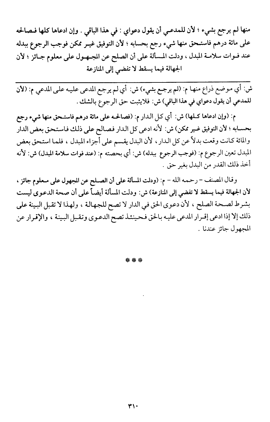 منها لم يرجع بشيء، لأن للمدعي أن يقول دعواي: في هذا الباقي. وإن ادعاها كلها فصالحه على مائة درهم فاستحق منها شيء رجع بحسابه؛ لأن التوفيق غير ممكن فوجب الرجوع ببدله عند فوات سلامة المبدل، ودلت المسألة على أن الصلح عن المجهول على معلوم جائز؛ لأن الجهالة فيما يسقط لا تفضي إلى المنازعة.