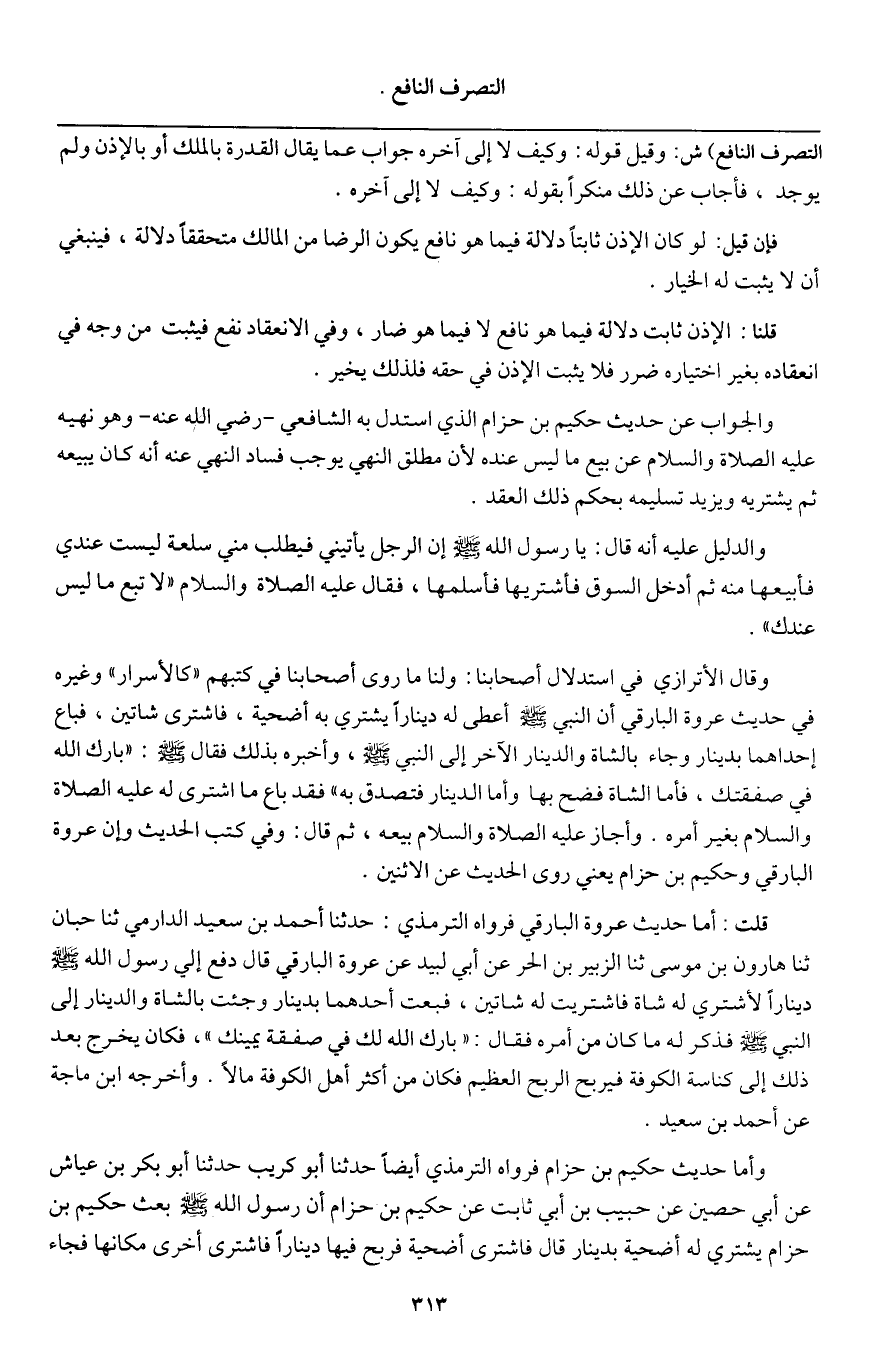 وقال الأترازي في استدلال أصحابنا: ولنا ما روى أصحابنا في كتبهم " كالأسرار " وغيره في «حديث عروة البارقي أن النبي - صَلَّى اللَّهُ عَلَيْهِ وَسَلَّمَ - أعطى له دينارا يشتري به أضحية، فاشترى شاتين، فباع إحداهما بدينار وجاء بالشاة والدينار الآخر إلى النبي - صَلَّى اللَّهُ عَلَيْهِ وَسَلَّمَ -، وأخبره بذلك فقال - صَلَّى اللَّهُ عَلَيْهِ وَسَلَّمَ -: "بارك الله في صفقتك، فأما الشاة فضح بها وأما الدينار فتصدق به» فقد باع ما اشترى له - عَلَيْهِ الصَّلَاةُ وَالسَّلَامُ - بغير أمره. وأجاز - عَلَيْهِ الصَّلَاةُ وَالسَّلَامُ - بيعه، ثم قال: وفي كتب الحديث وإن عروة البارقي وحكيم بن حزام يعني روى الحديث عن الاثنين.
