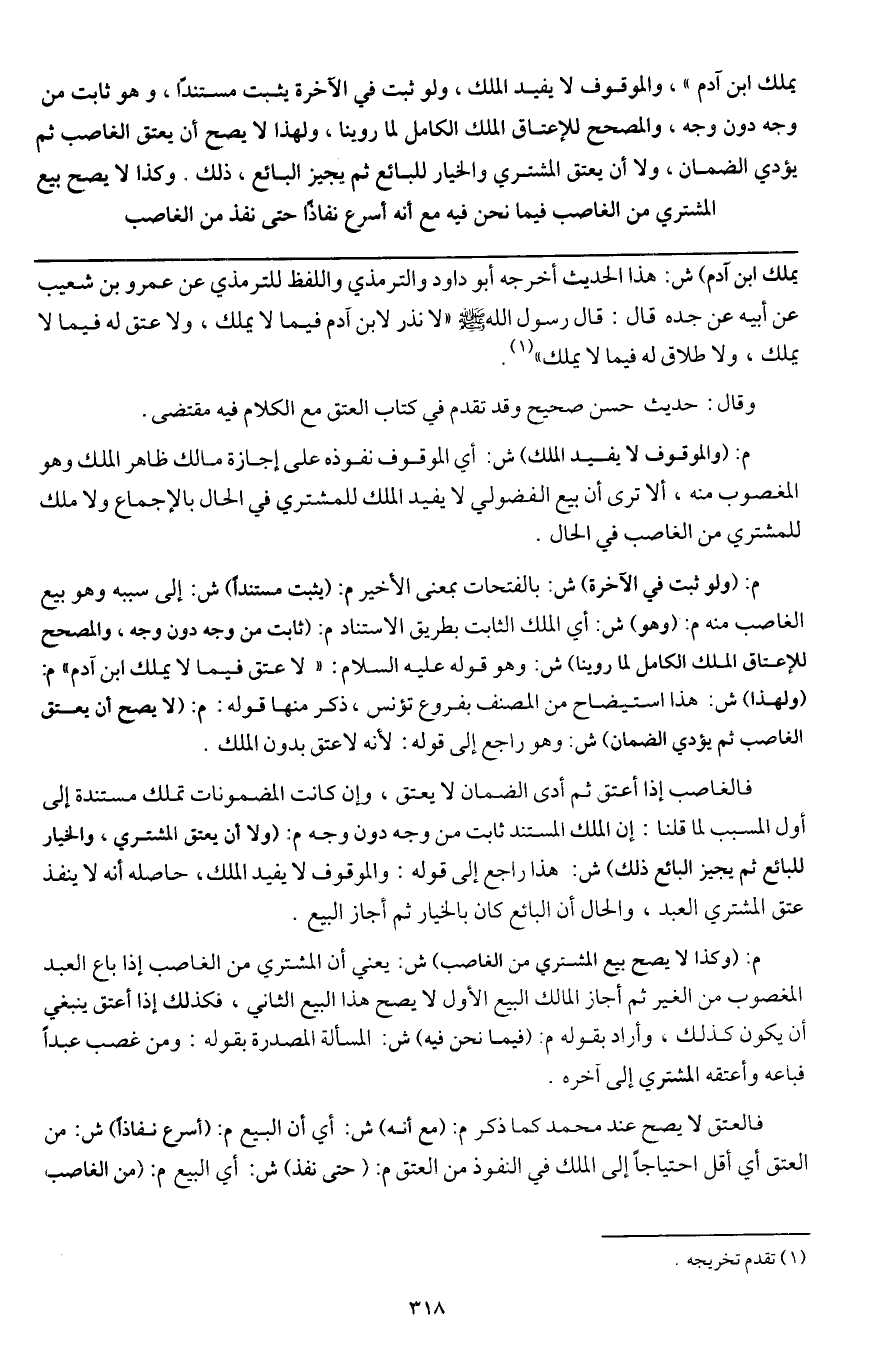ـــــــــــــــــــــــــــــQيملك ابن آدم» ش: هذا الحديث أخرجه أبو داود والترمذي واللفظ للترمذي عن عمرو بن شعيب عن أبيه عن جده قال: قال رسول الله - صَلَّى اللَّهُ عَلَيْهِ وَسَلَّمَ - «لا نذر لابن آدم فيما لا يملك، ولا عتق له فيما لا يملك، ولا طلاق له فيما لا يملك» .