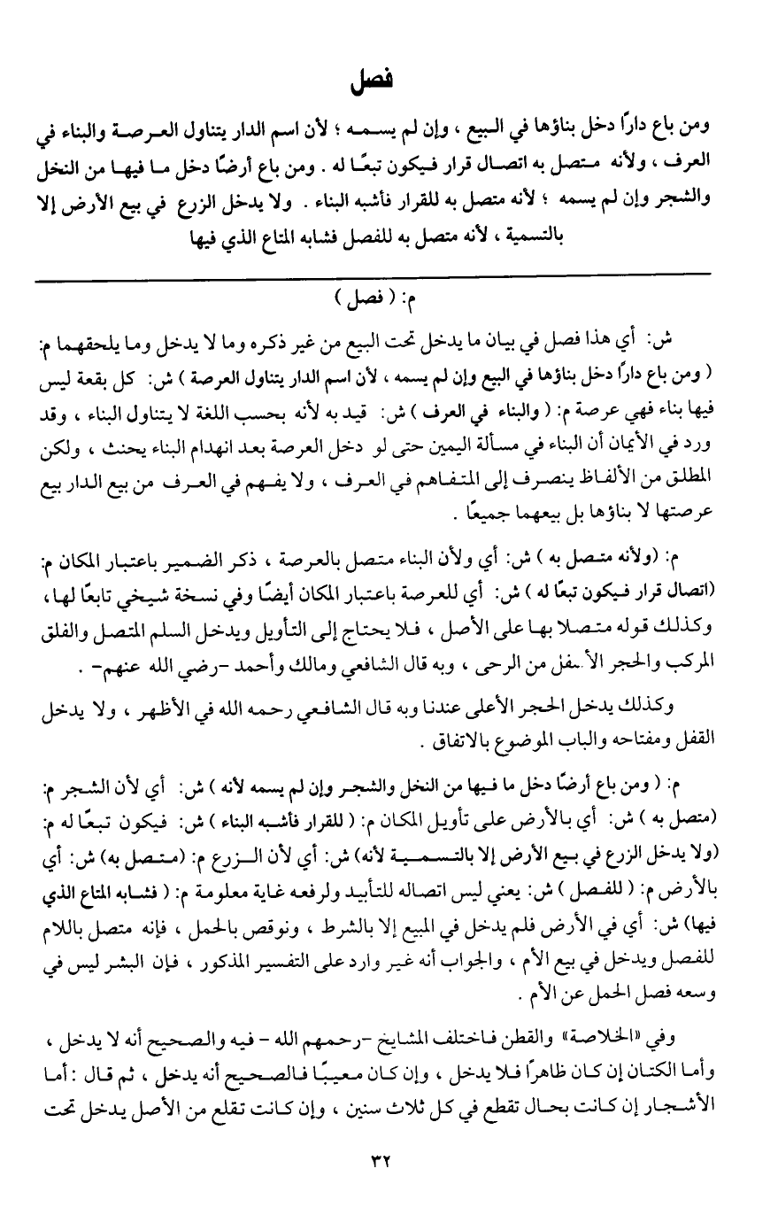 فصل ومن باع دارا دخل بناؤها في البيع، وإن لم يسمه؛ لأن اسم الدار يتناول العرصة والبناء في العرف، ولأنه متصل به اتصال قرار فيكون تبعا له. ومن باع أرضا دخل ما فيها من النخل والشجر وإن لم يسمه؛ لأنه متصل به للقرار فأشبه البناء. ولا يدخل الزرع في بيع الأرض إلا بالتسمية؛ لأنه متصل به للفصل فشابه المتاع الذي فيها