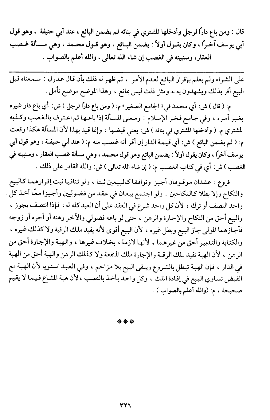 قال: ومن باع دارا لرجل وأدخلها المشتري في بنائه لم يضمن البائع، عند أبي حنيفة، وهو قول أبي يوسف آخرا، وكان يقول أولا: يضمن البائع، وهو قول محمد، وهي مسألة غصب العقار، وسنبينه في الغصب إن شاء الله تعالى، والله أعلم بالصواب.