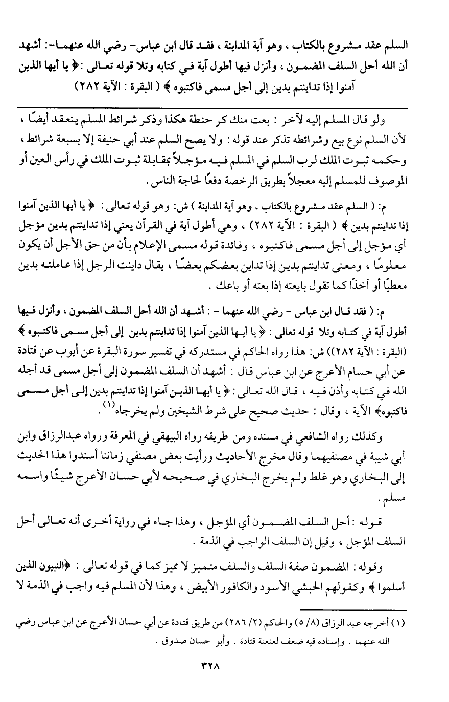 م: (فقد قال ابن عباس - رَضِيَ اللَّهُ عَنْهُمَا -: أشهد أن الله أحل السلف المضمون، وأنزل فيها أطول آية في كتابه وتلا قَوْله تَعَالَى: {يَا أَيُّهَا الَّذِينَ آمَنُوا إِذَا تَدَايَنْتُمْ بِدَيْنٍ إِلَى أَجَلٍ مُسَمًّى فَاكْتُبُوهُ} [البقرة: 282] (البقرة: الآية 282)) ش: هذا رواه الحاكم في مستدركه في تفسير سورة البقرة عن أيوب عن قتادة عن أبي حسام الأعرج عن ابن عباس قال: أشهد أن السلف المضمون إلى أجل مسمى قد أحله الله في كتابه وأذن فيه، قال الله تعالى: {يَا أَيُّهَا الَّذِينَ آمَنُوا إِذَا تَدَايَنْتُمْ بِدَيْنٍ إِلَى أَجَلٍ مُسَمًّى فَاكْتُبُوهُ} [البقرة: 282] الآية، وقال: حديث صحيح على شرط الشيخين ولم يخرجاه.