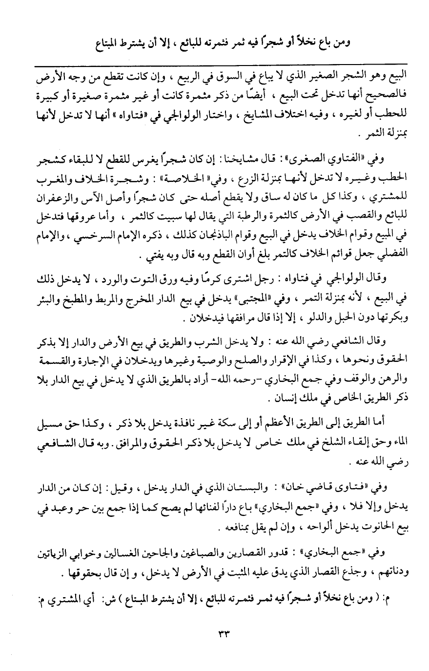 ـــــــــــــــــــــــــــــQالبيع وهو الشجر الصغير الذي لا يباع في السوق في الربيع، وإن كانت تقطع من وجه الأرض فالصحيح أنها تدخل تحت البيع، أيضا من ذكر مثمرة كانت أو غير مثمرة، صغيرة أو كبيرة، للحطب أو لغيره، وفيه اختلاف المشايخ، واختار الولوالجي في "فتاواه " أنها لا تدخل؛ لأنها بمنزلة الثمر.