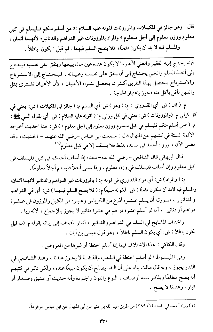 م: (قال) ش: أي القدوري: م: (وهو) ش: أي السلم م: جائز في المكيلات) ش: يعني في كل كيلي م: والموزونات) ش: يعني في كل وزني م: (لقوله - عَلَيْهِ السَّلَامُ -) ش: أي لقول النبي - صَلَّى اللَّهُ عَلَيْهِ وَسَلَّمَ - م: «من أسلم منكم فليسلم في كيل معلوم ووزن معلوم إلى أجل معلوم» ش: هذا الحديث أخرجه الأئمة الستة في كتبهم عن المنهال قال: سمعت ابن عباس - رَضِيَ اللَّهُ عَنْهُمَا - الحديث، وقد مضى الآن، ورواه أحمد في مسنده بلفظ «فلا يسلف إلا في كيل معلوم» .